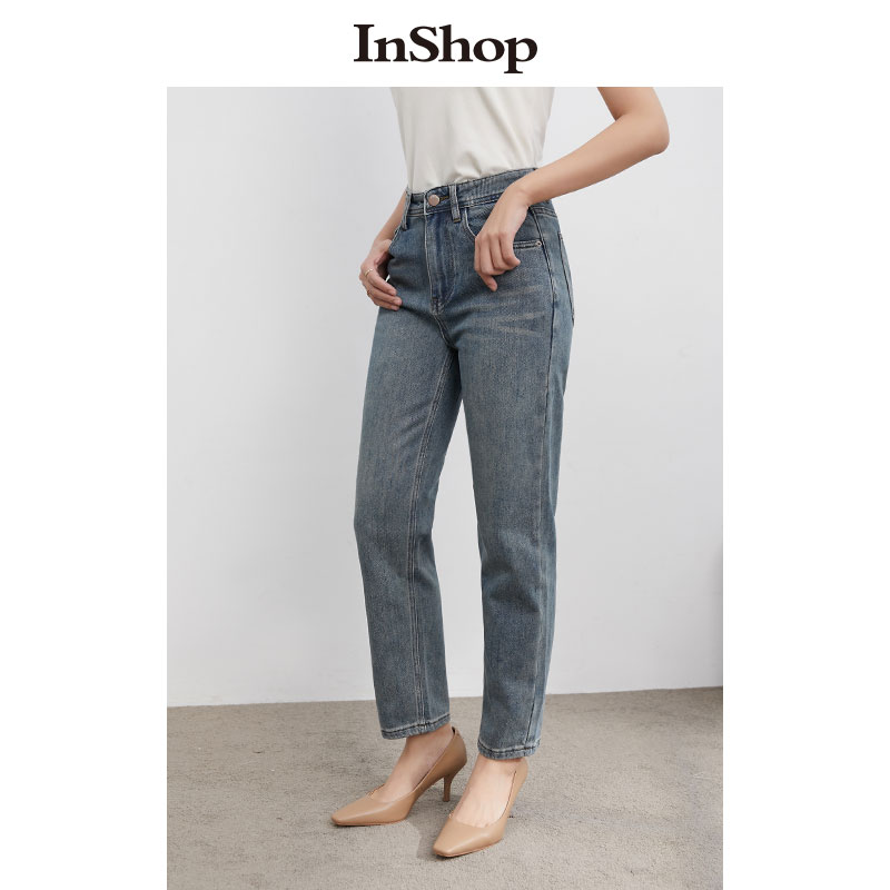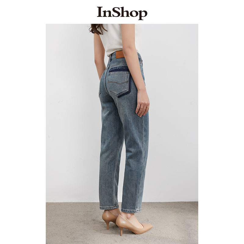【商场同款】INSHOP新款高腰牛仔裤女时髦撞色口袋显瘦通勤哈伦裤