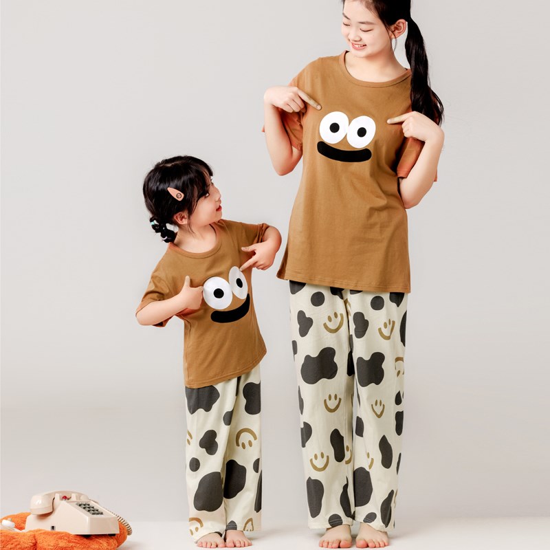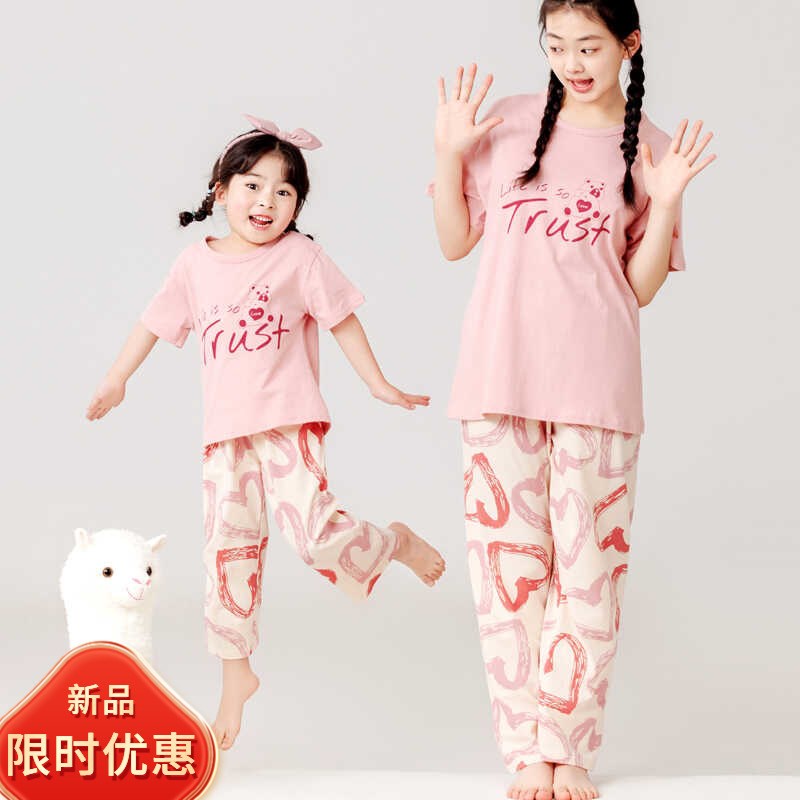 纯棉女童睡衣儿童夏季薄款短袖长裤套装可爱女孩中大童家居服母女
