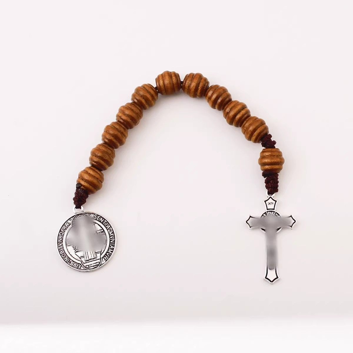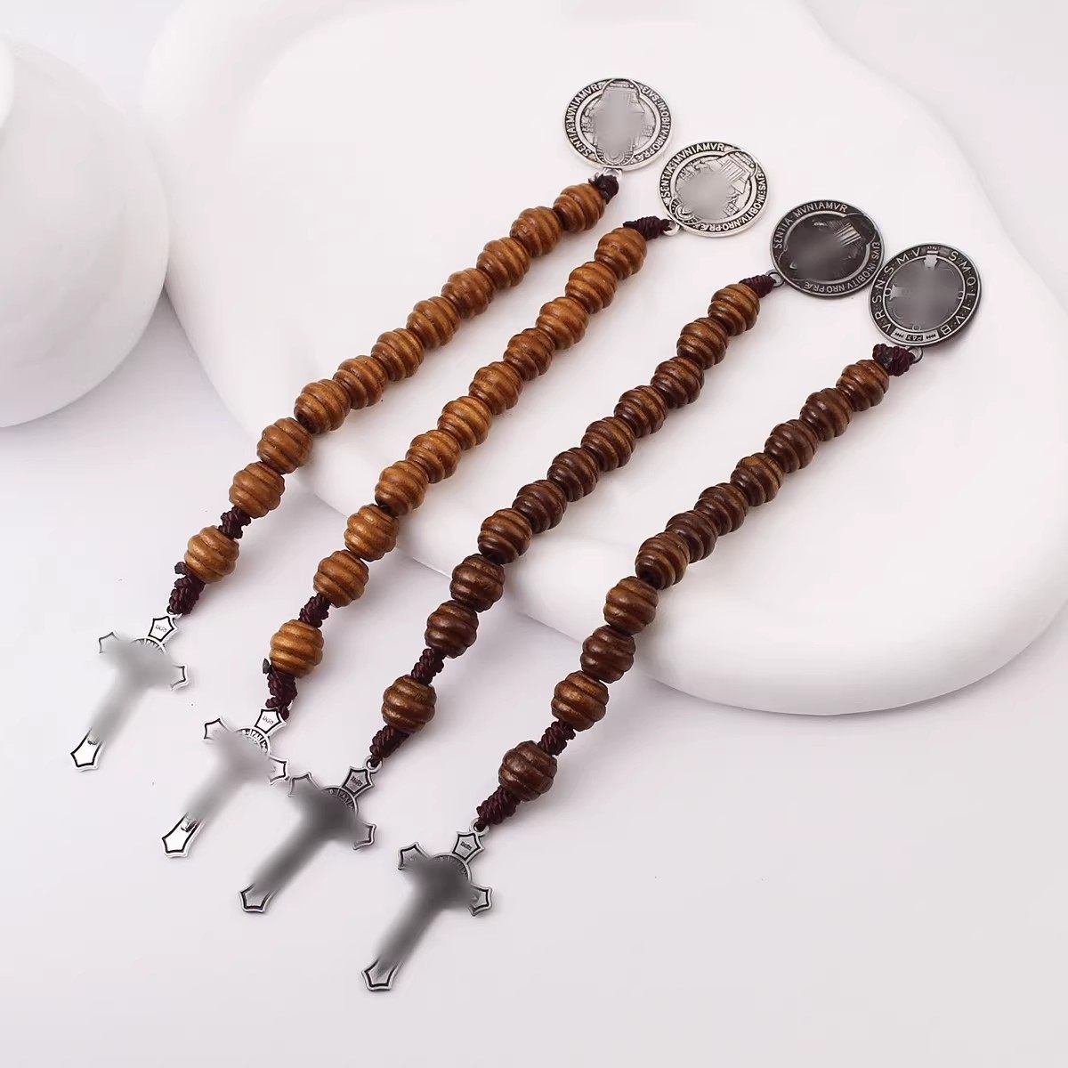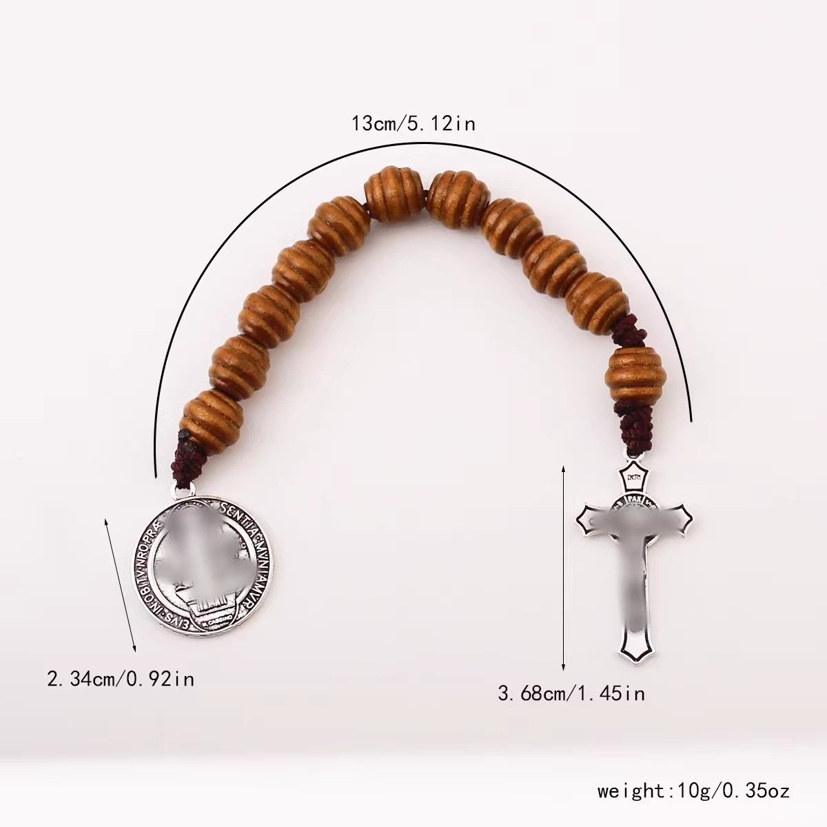 创意Catholicism十字架棕色木珠合金本笃奖章祈祷口袋念珠