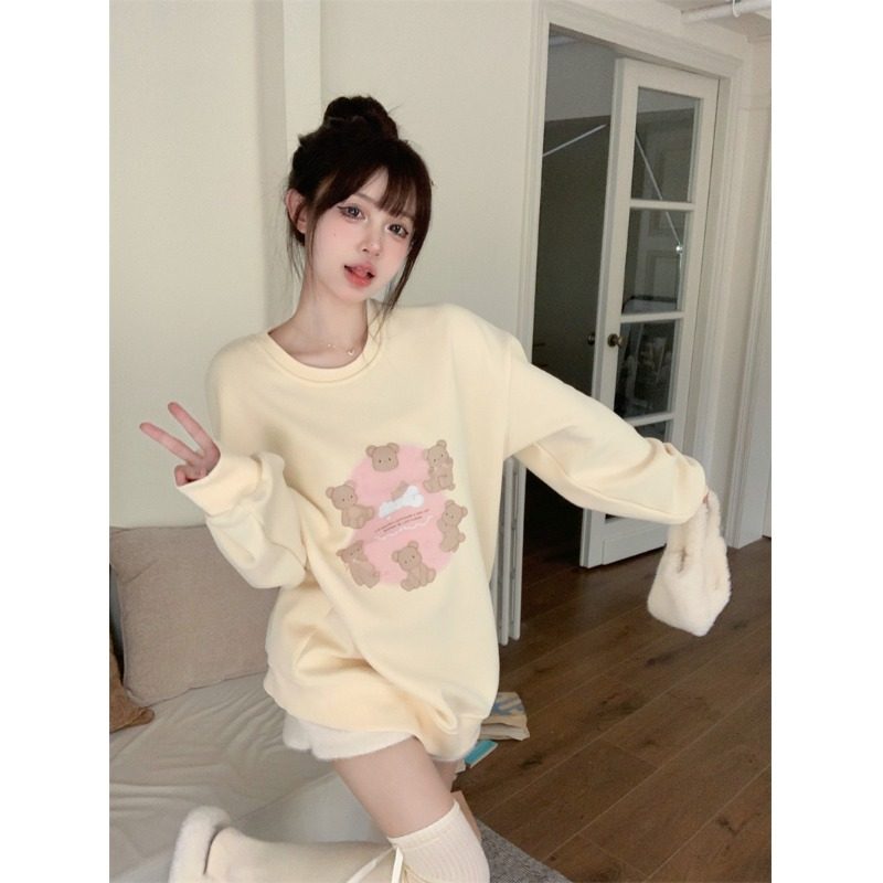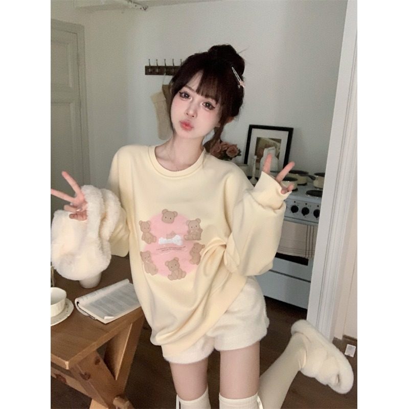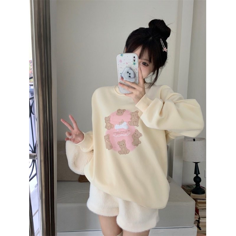 加绒加厚小熊印花长袖圆领卫衣女秋冬季韩版慵懒宽松百搭套头上衣