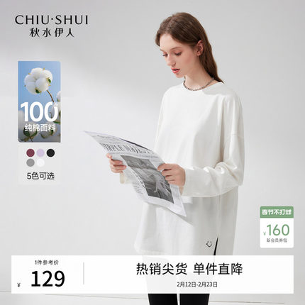 秋水伊人白色T恤女纯棉长袖上衣 2026春季新款宽松内搭圆领女装