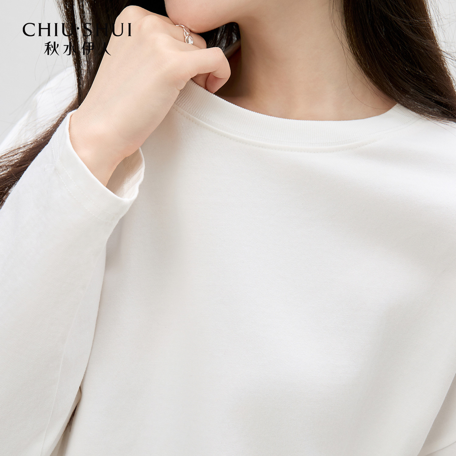 秋水伊人白色T恤女纯棉长袖上衣