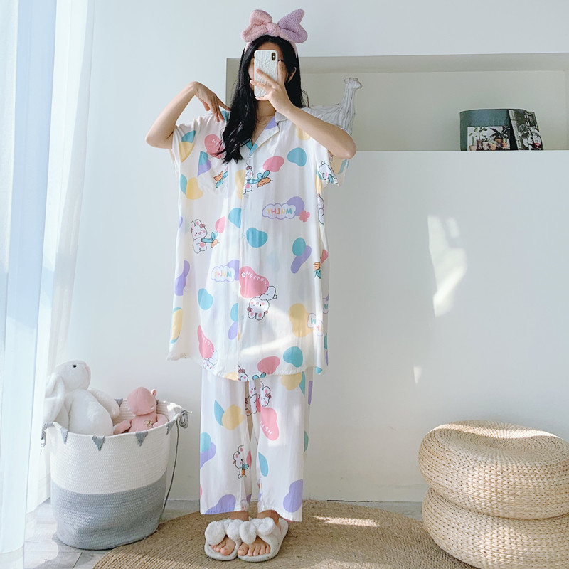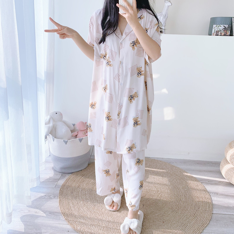 加大码棉绸长款睡衣短袖九分裤春夏人棉开衫宽松胖mm200斤家居服