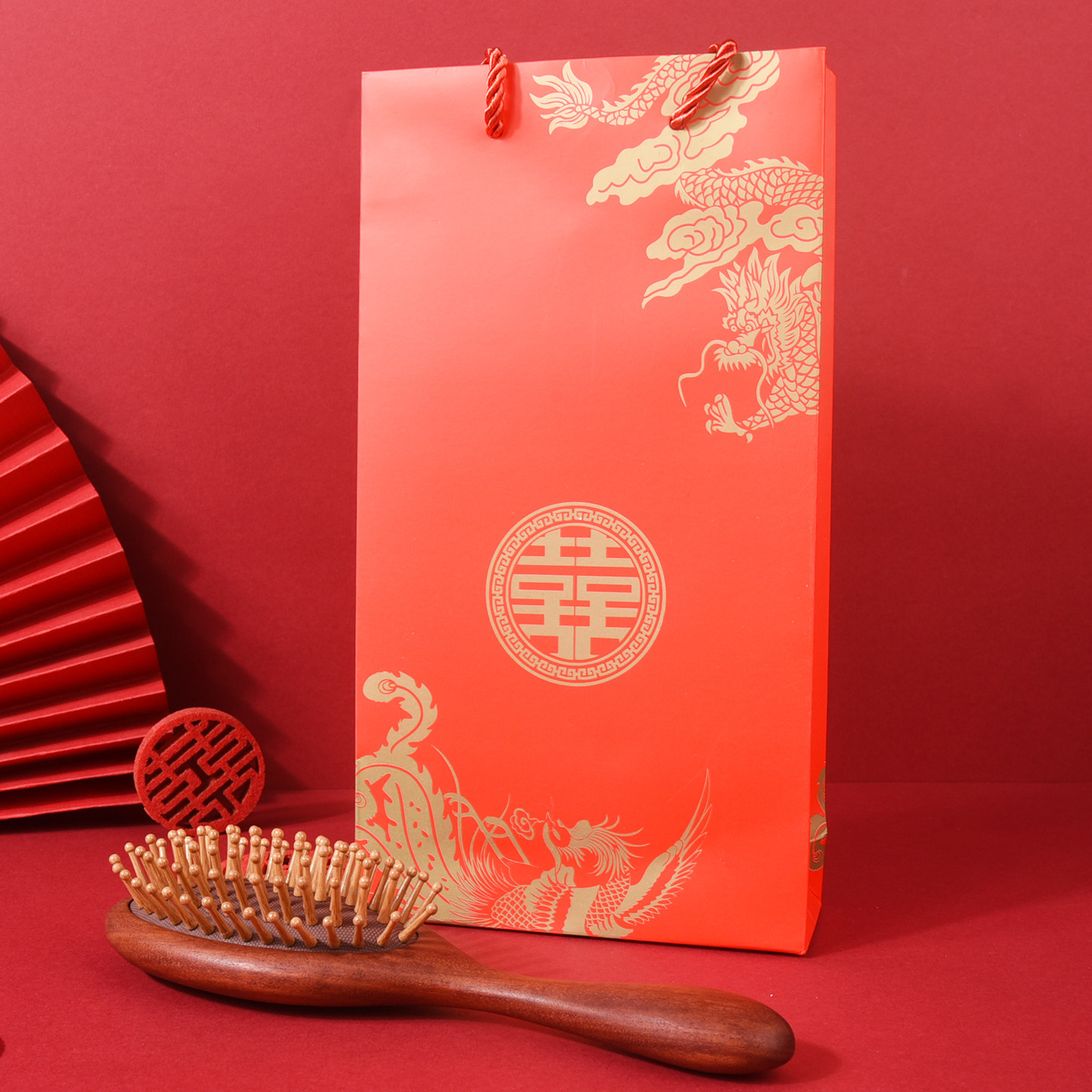 结婚梳子一对檀木镜子女陪嫁妆订婚套装红喜送新人礼物气囊气囊梳