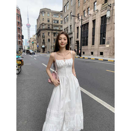 辰米范 法式白色收腰吊带连衣裙女夏季高级感气质显瘦拼接蕾丝裙