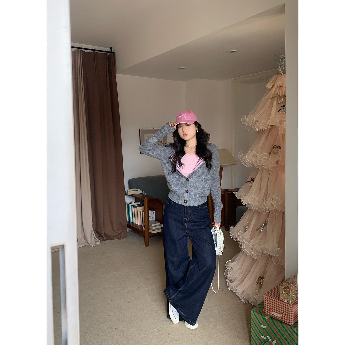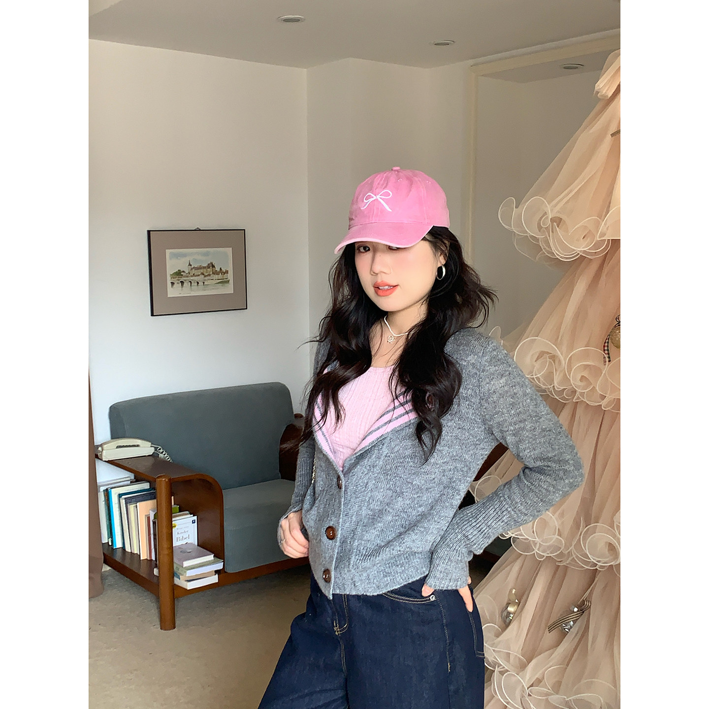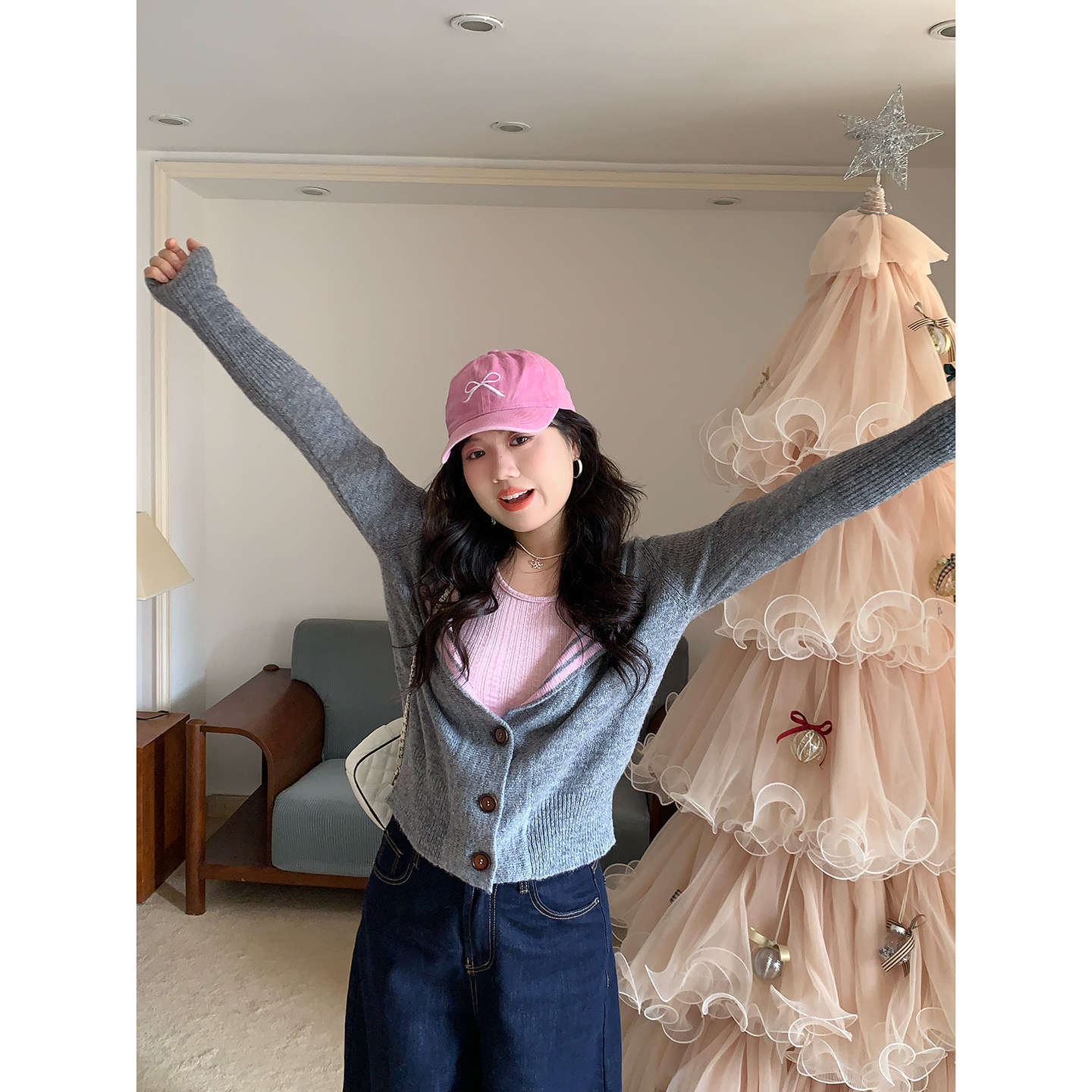 米米子微胖大码胖mm“雾灰拿铁”松弛风条纹针织开衫毛衣背心套装