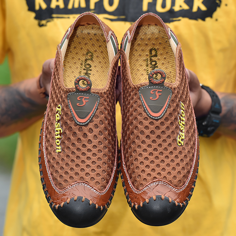 旗牌公牛夏季透气真皮男士休闲网面凉鞋运动一脚蹬懒人网眼网布鞋
