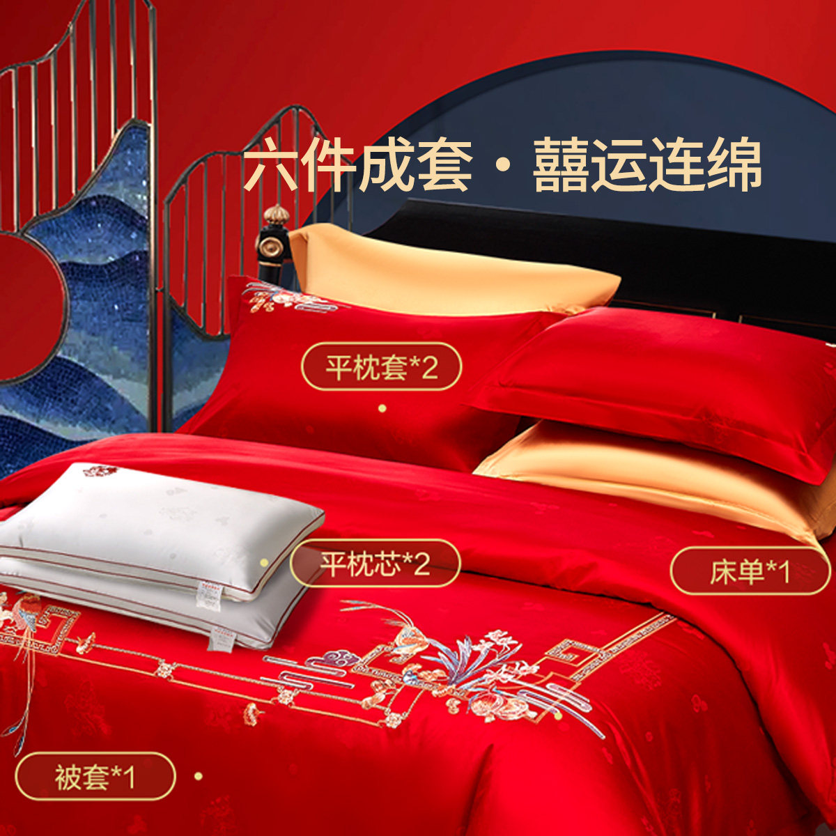富安娜结婚多件套床上婚嫁喜被婚庆四件套婚庆高端刺绣大红色床单