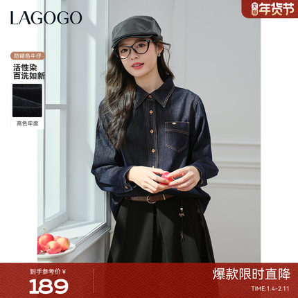 复古丹宁牛仔衬衫LAGOGO翻领上衣