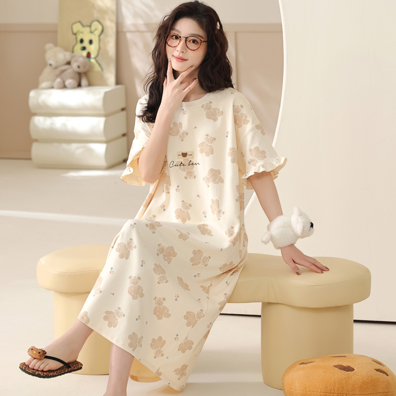 卡之恋睡裙女款2025新款夏短袖带胸垫睡衣纯棉大码胖MM孕妇家居服