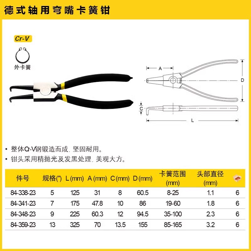 史丹利德式轴用弯嘴卡簧钳5/7/9/13寸84-338/341/348/359-23