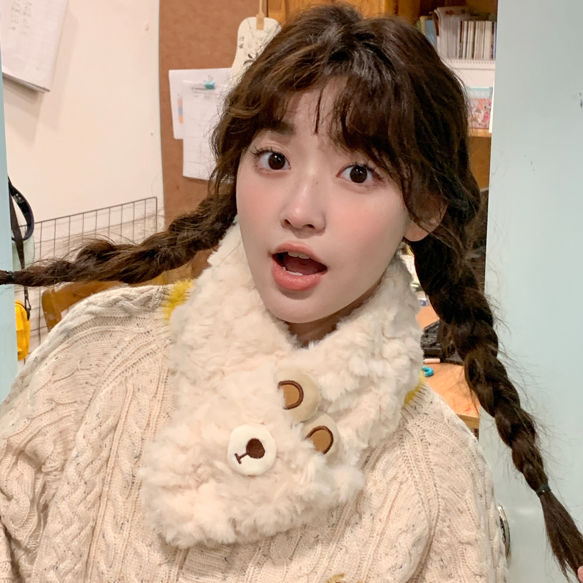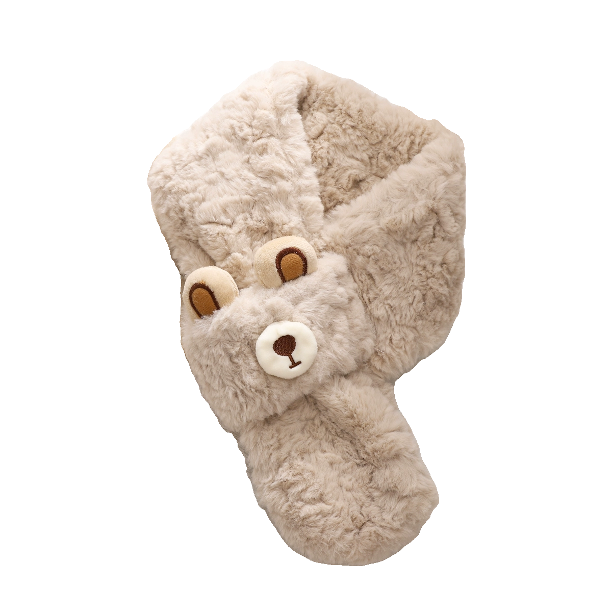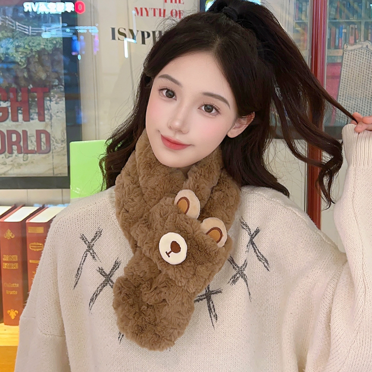 软萌可爱交叉毛绒围巾女冬季网红韩版百搭学生围脖套保暖小熊毛领