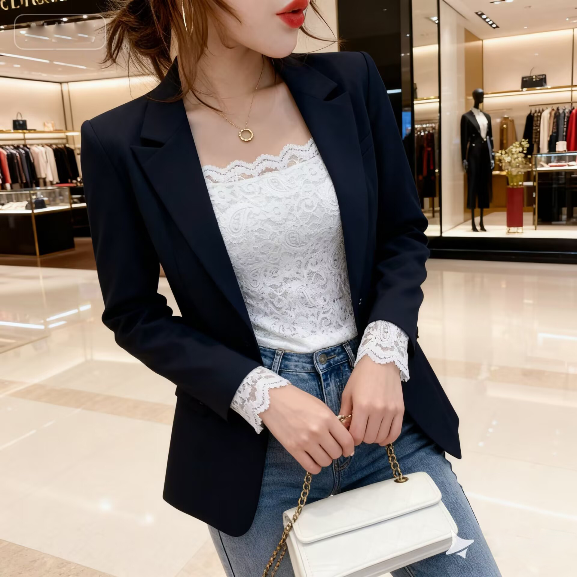波浪蕾丝t恤女钩花镂空网纱方领长袖打底衫薄款内搭大码别致上衣