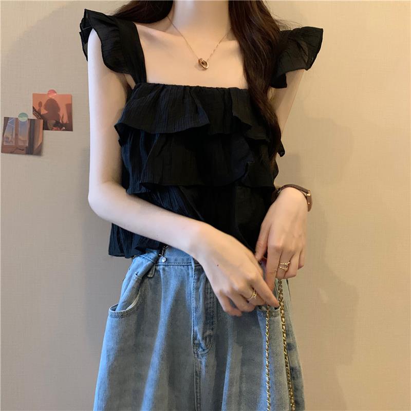 夏季女2024年新款法式独特别致小飞袖吊带雪纺衬衫荷叶边短款上衣