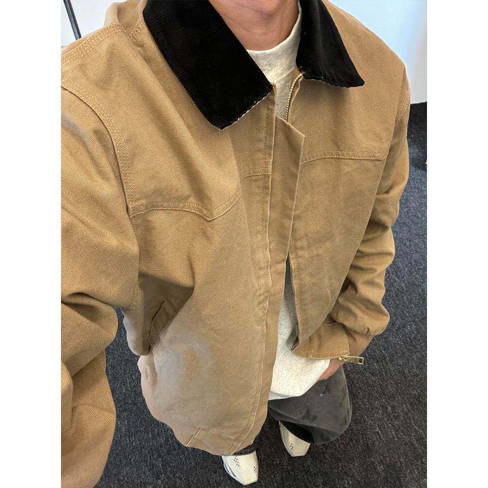 卡其色帆布水洗牛仔外套男款美式覆古高级感痞帅潮牌翻领工装夹克