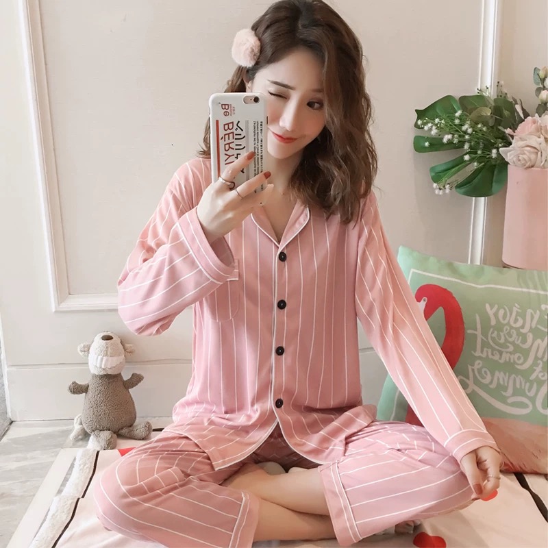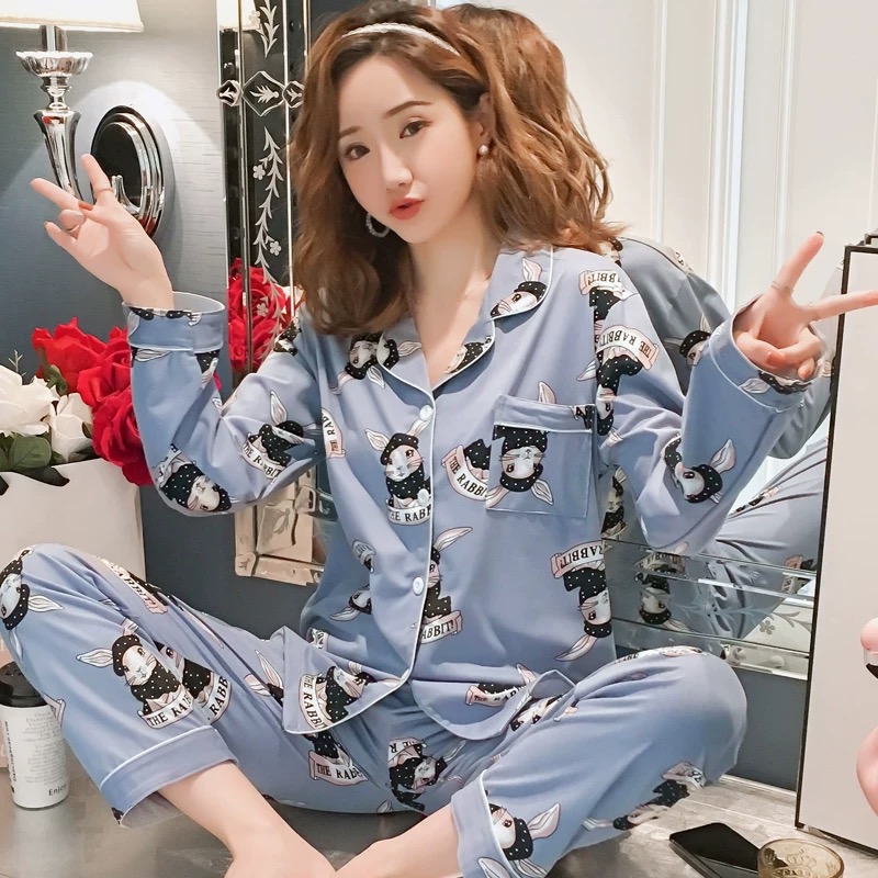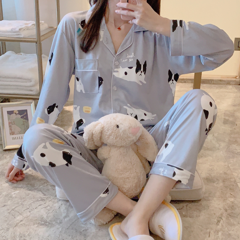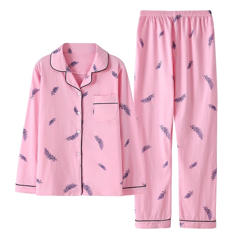 睡衣女春秋夏季薄款长袖开衫纯棉韩版外穿全棉月子家居服两件套装