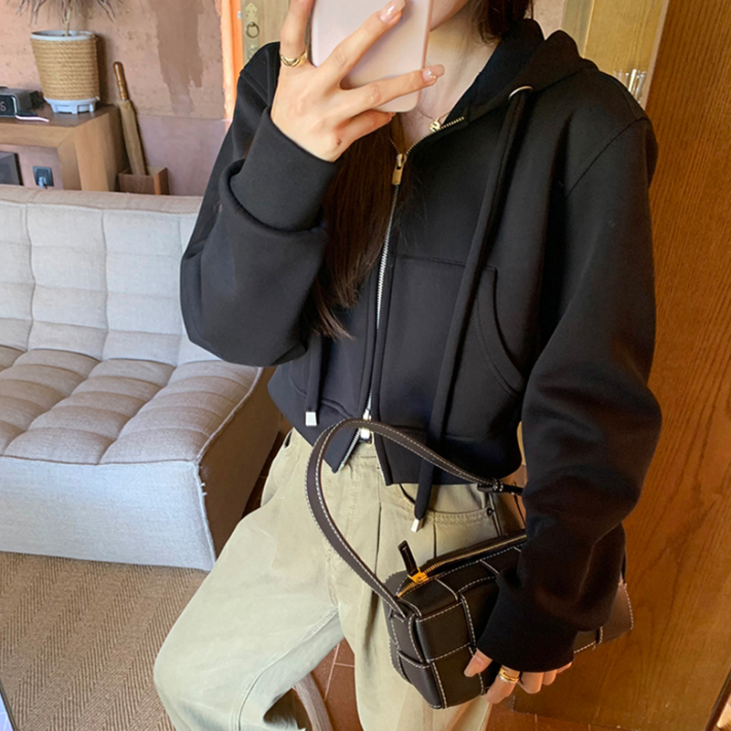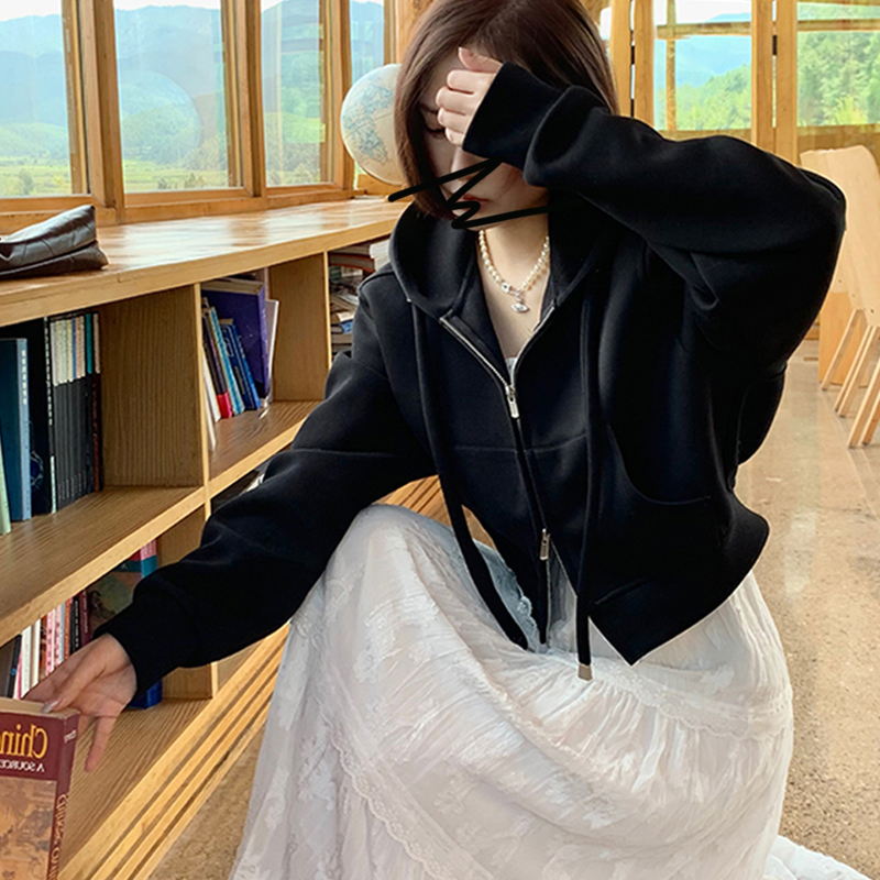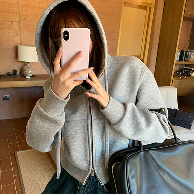 短款连帽灰色卫衣外套女款小个子秋冬加绒拉链韩系慵懒松弛感上衣