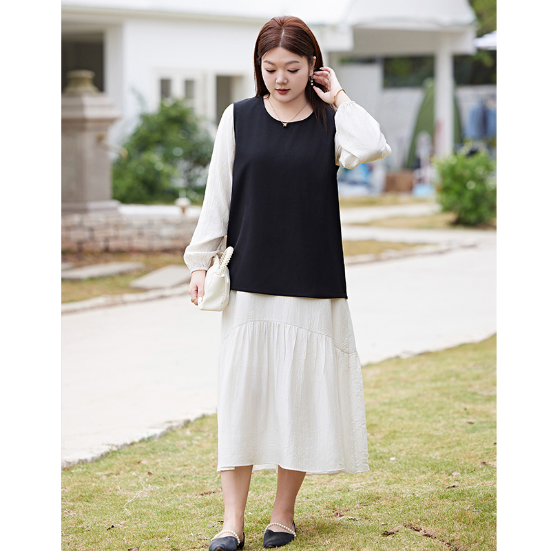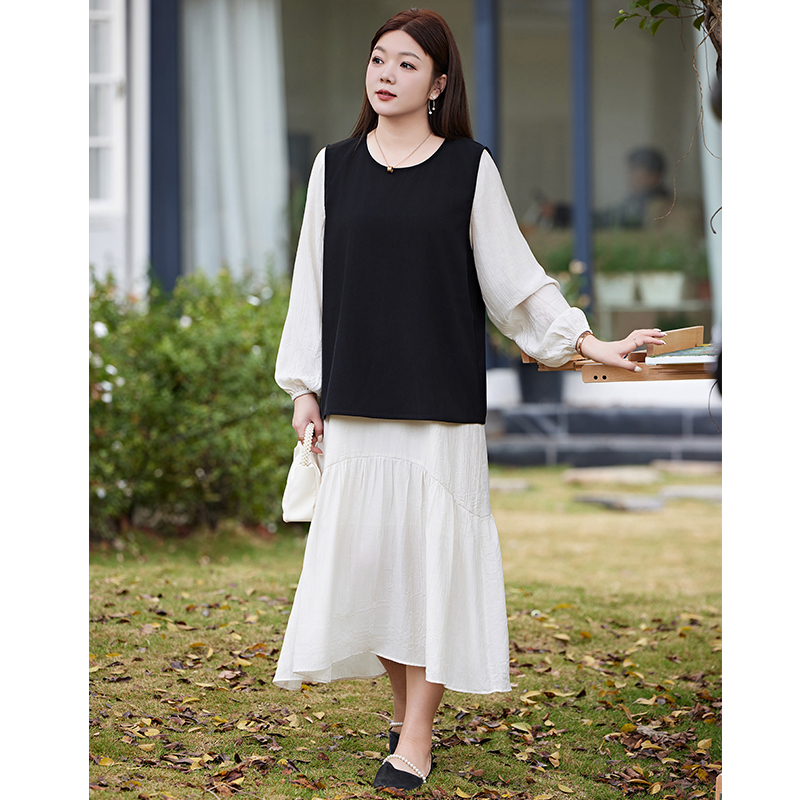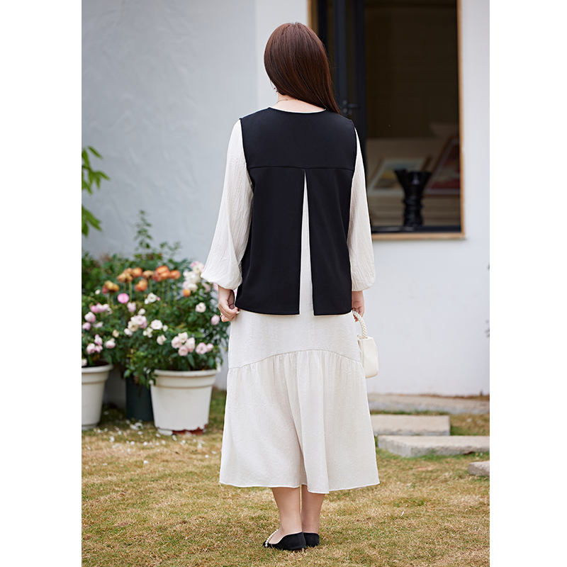 秋装新款设计法式V领宽松大码长袖连衣裙女开叉西装马甲两件套装