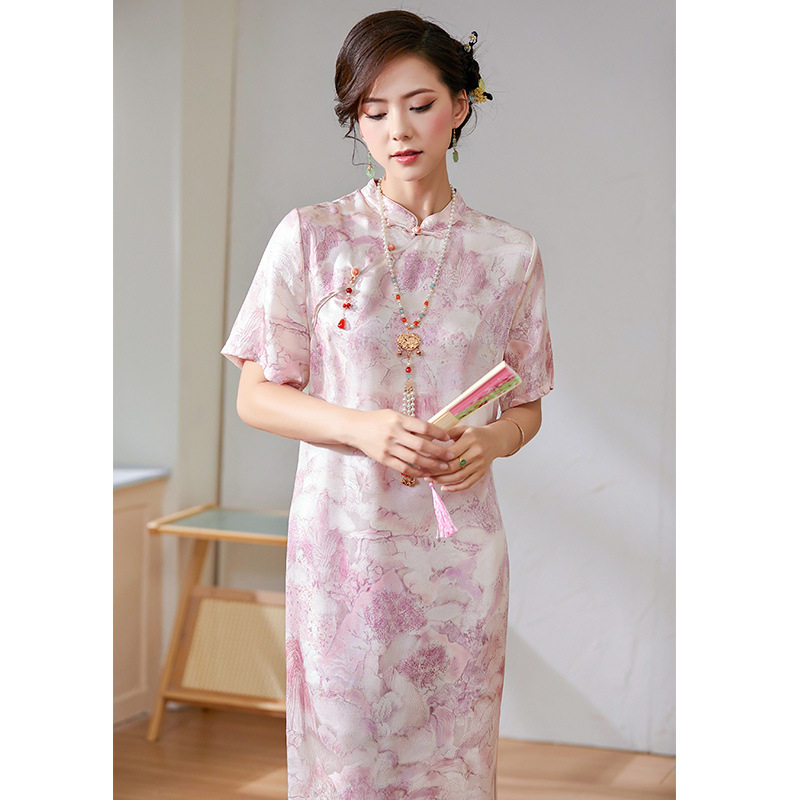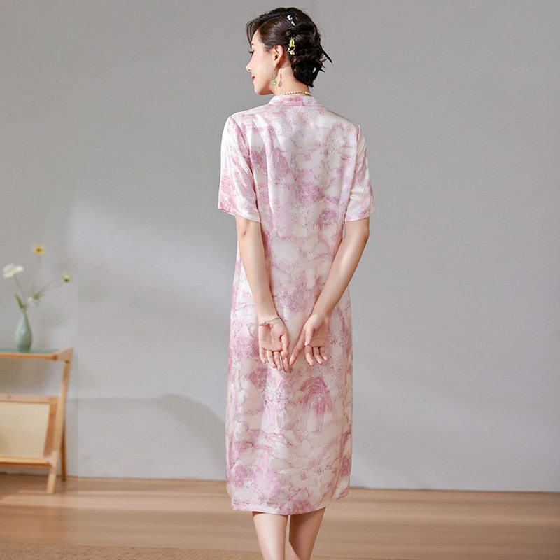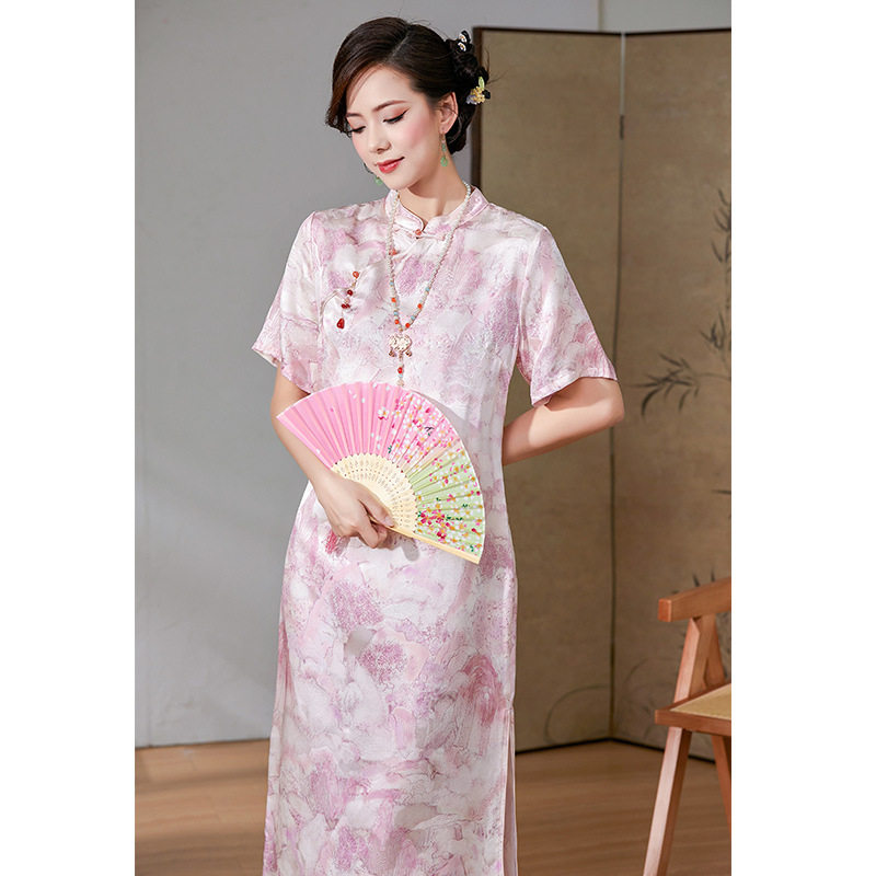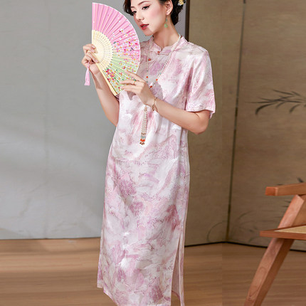 新中式国风重磅真丝提花立领盘扣短袖开叉改良旗袍连衣裙桑蚕丝