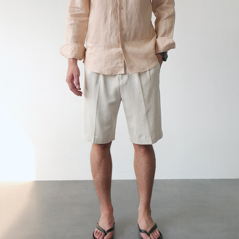 GBHP亚麻老钱极简宽松休闲短裤男士夏季慵懒感双褶透气五分裤西裤