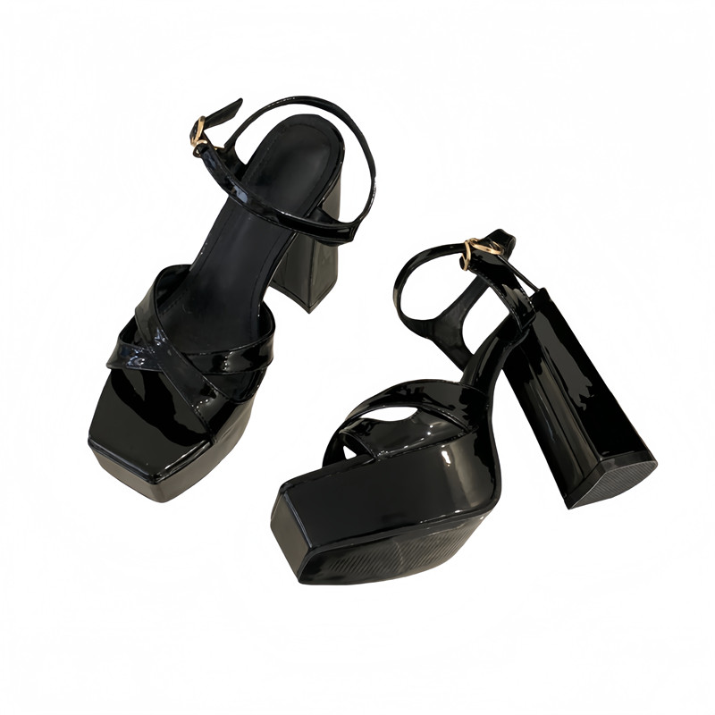 模特走秀鞋!13cm超高跟女鞋不累脚漆皮粗跟防水台一字扣带凉鞋女
