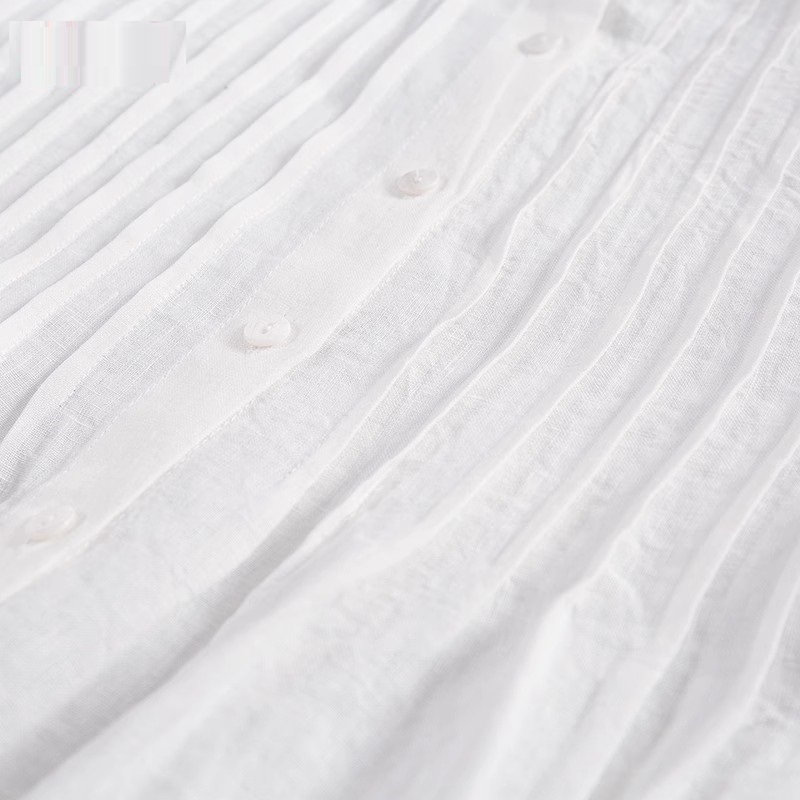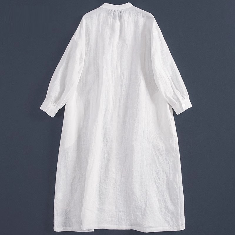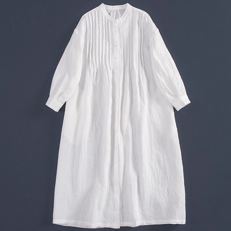 日系白色褶皱棉麻连衣裙女春秋新款宽松显瘦休闲中长款过膝衬衫裙