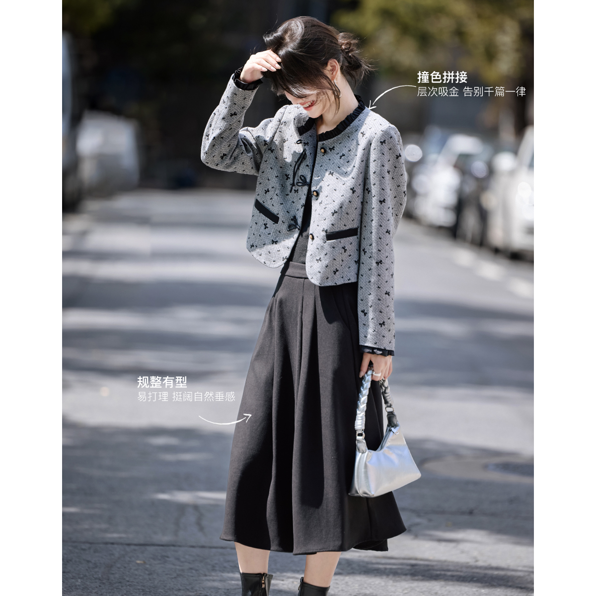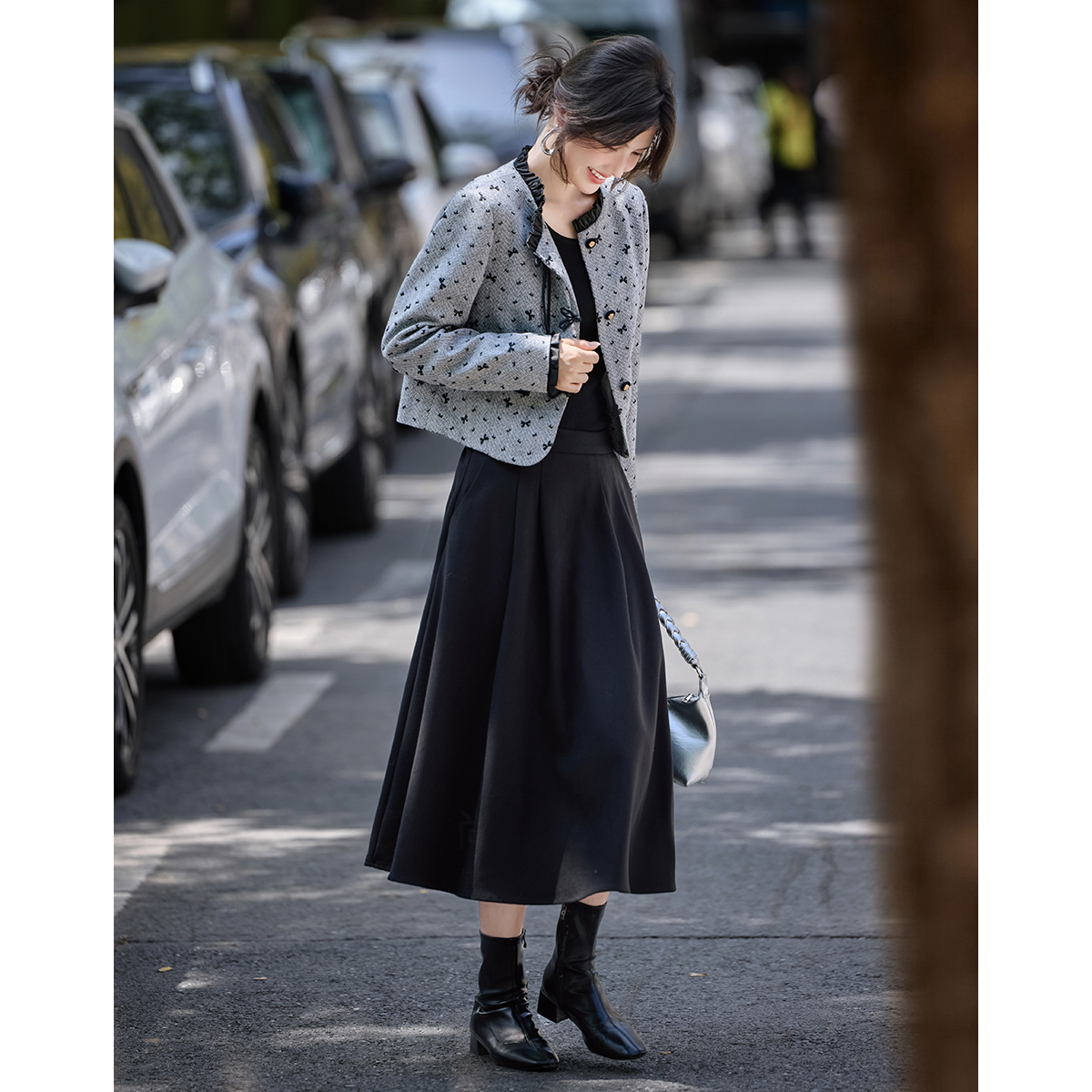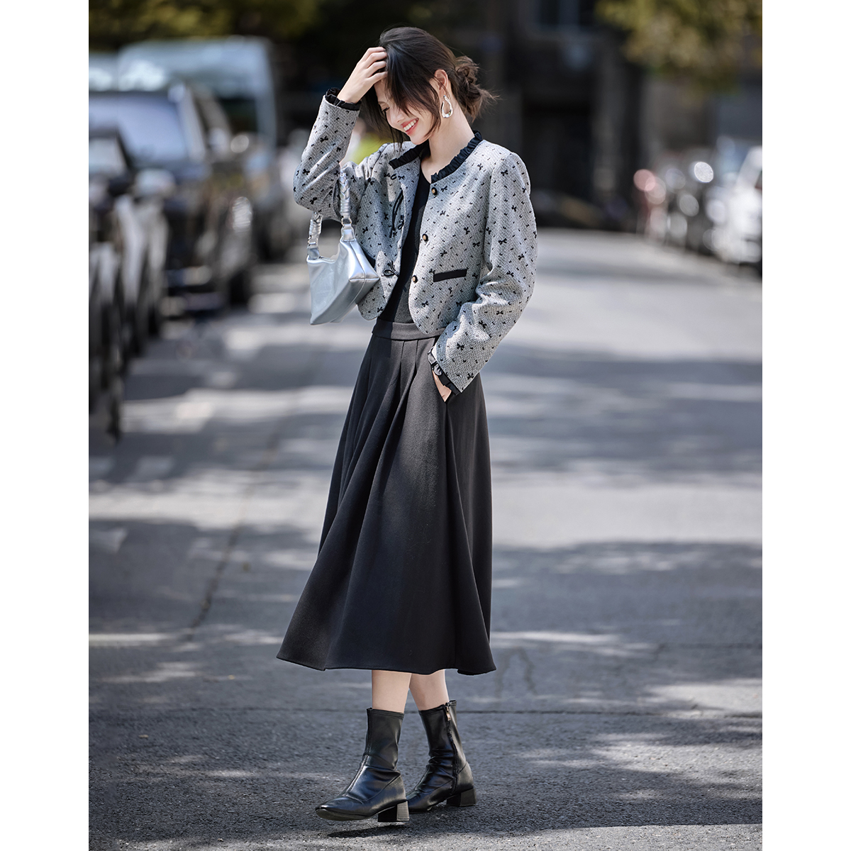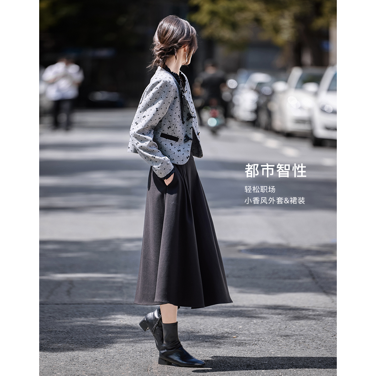 小香风通勤套装女2025春秋新款印花上衣短款外套中长半身裙两件套