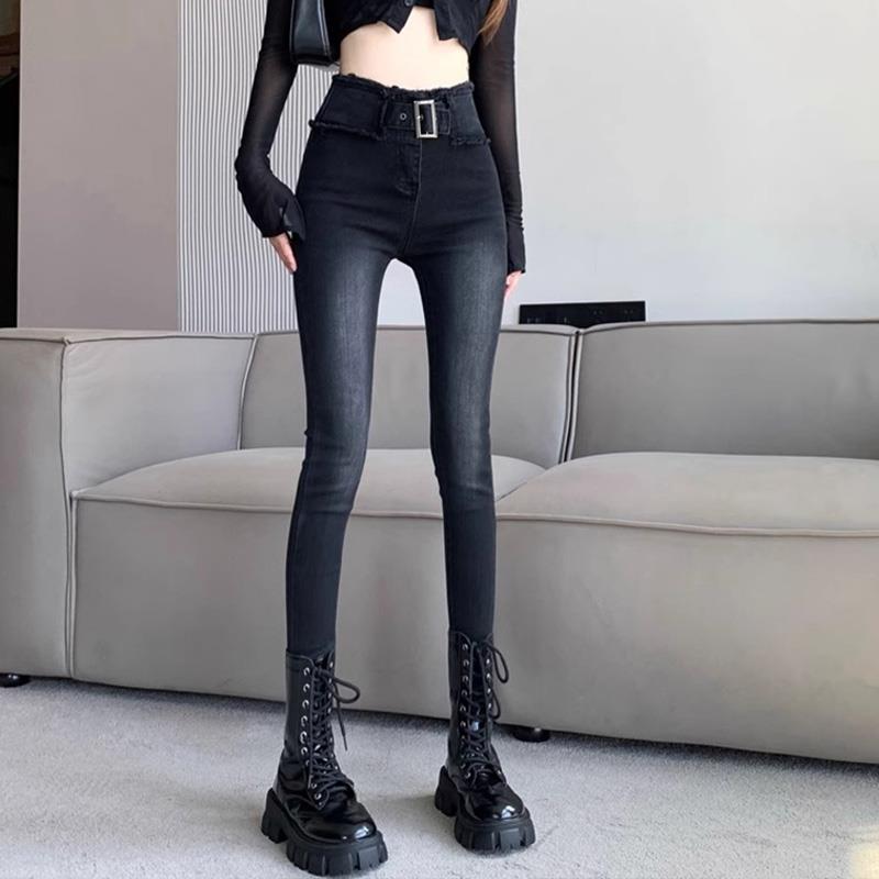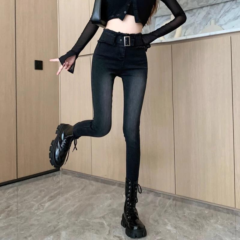 复古黑灰色紧身牛仔裤女秋冬配腰带高腰弹力修身显瘦小脚铅笔裤子