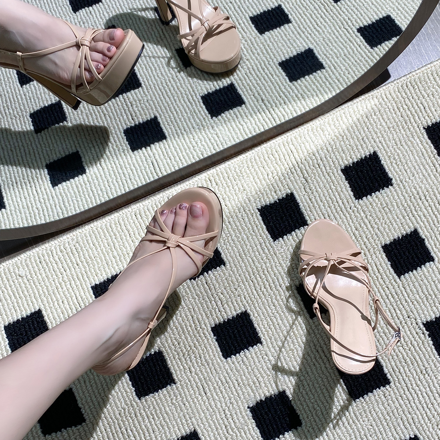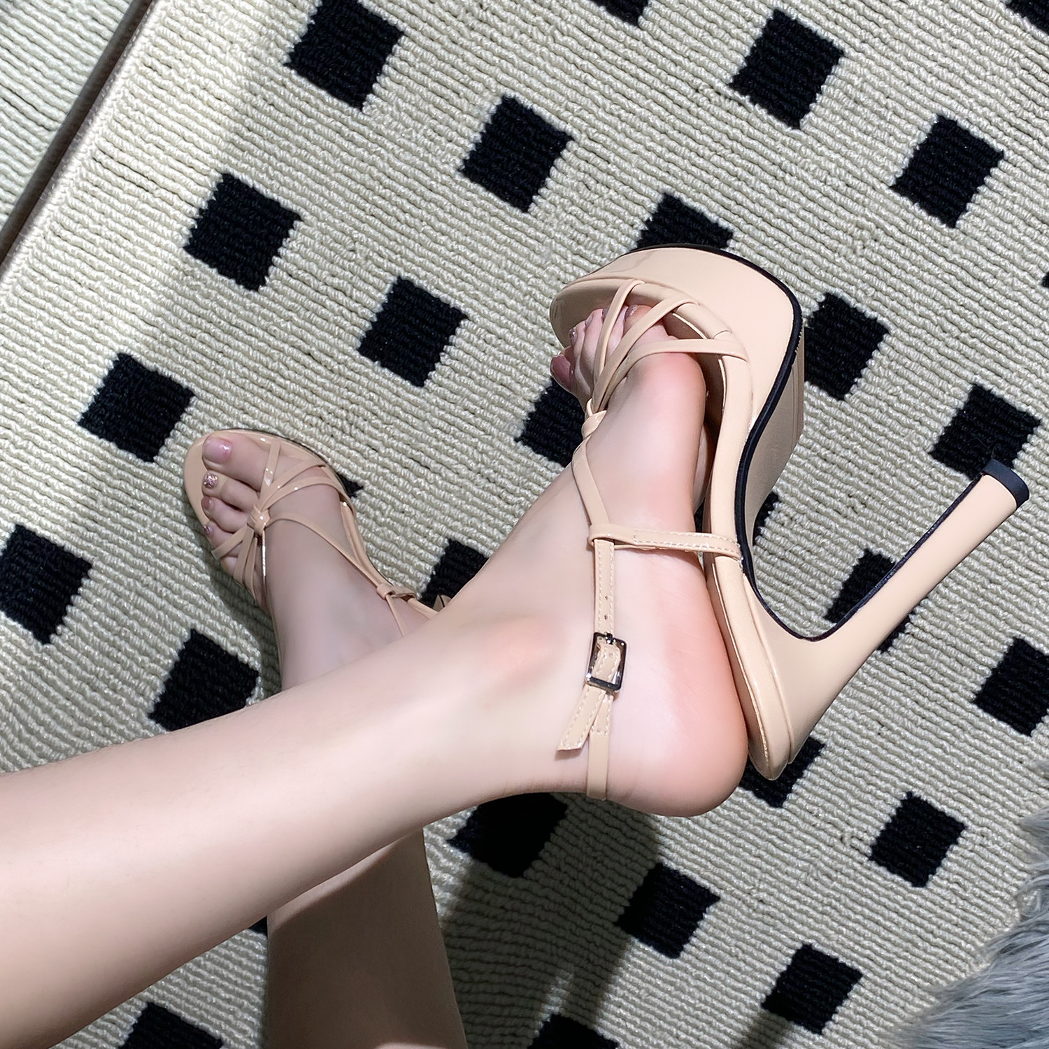 夏季新款交叉一字带防水台露趾凉鞋细跟圆头性感通勤裸色高跟鞋女