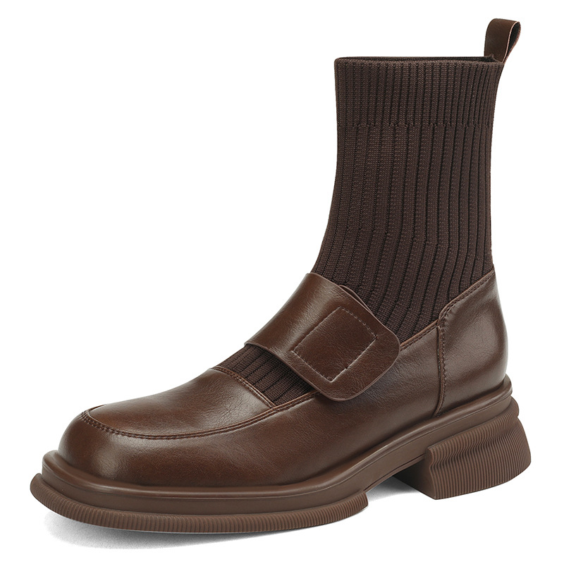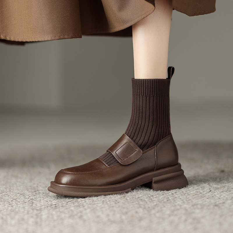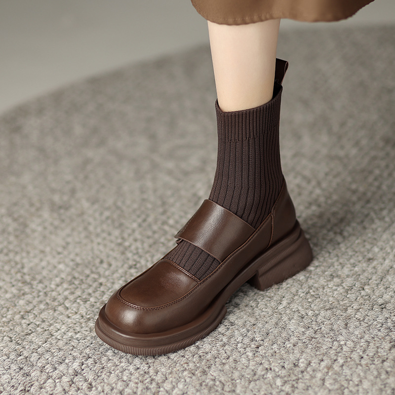 复古风圆头2024年秋冬单靴粗跟小个子厚底针织袜靴女新款真皮短靴