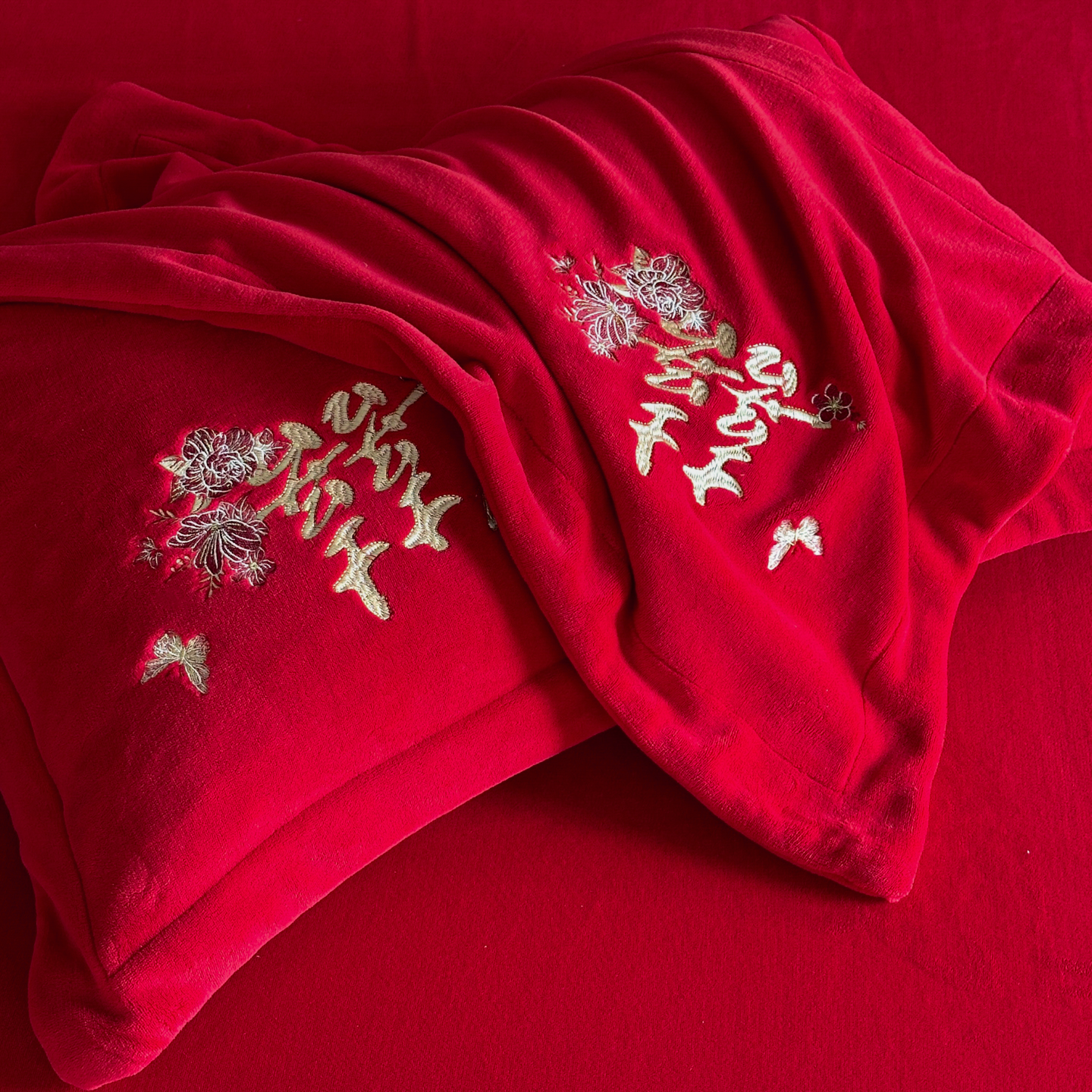 2025新款结婚牛奶绒四件套红色婚被套加厚保暖珊瑚绒婚房床上用品