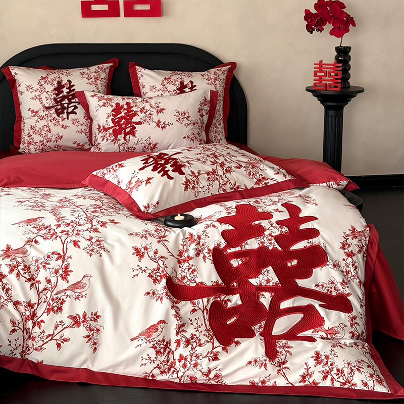 高档结婚100S长绒棉四件套喜字刺绣婚庆被套新房喜嫁全棉纯棉床品
