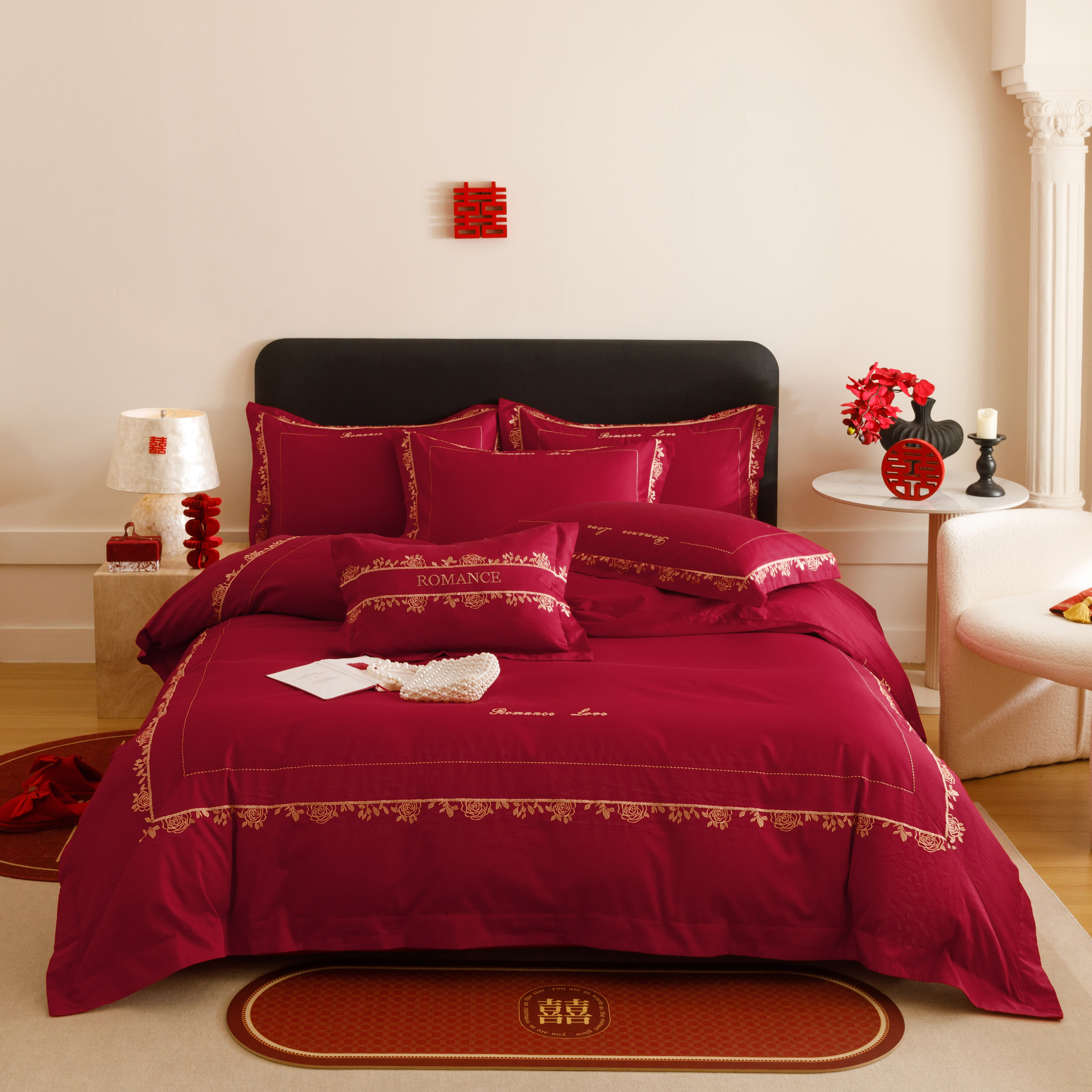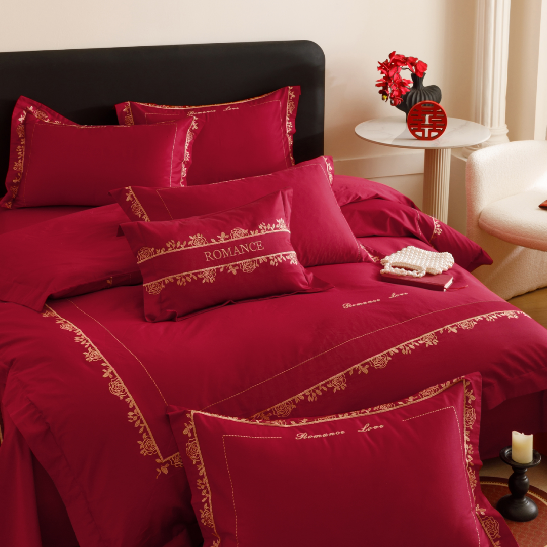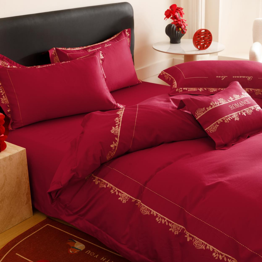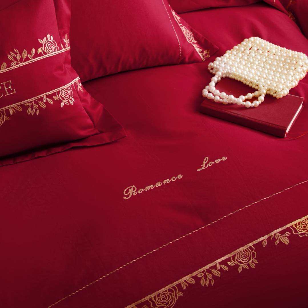 高端100S长绒棉全棉婚庆四件套红色花卉刺绣被套床单结婚床上用品