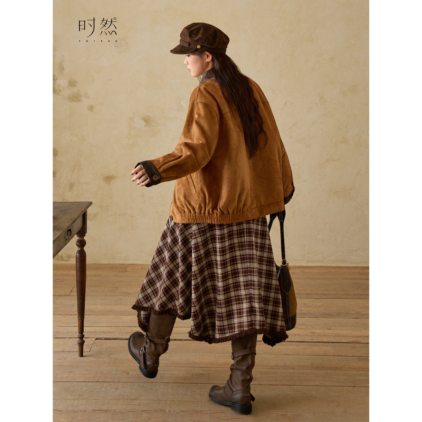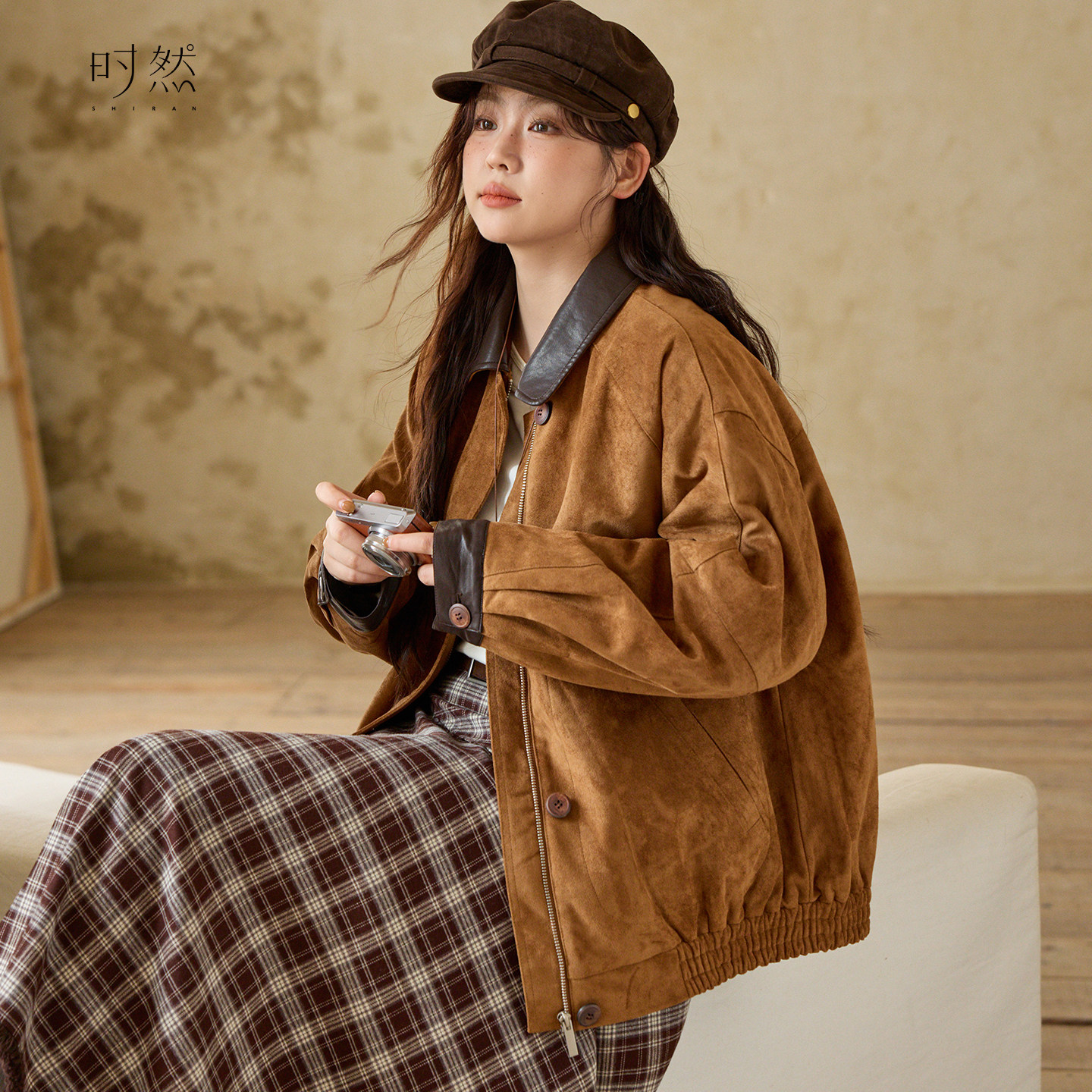 时然大码女装麂皮绒外套秋冬新款微胖MM宽松时尚复古夹克上衣冬装