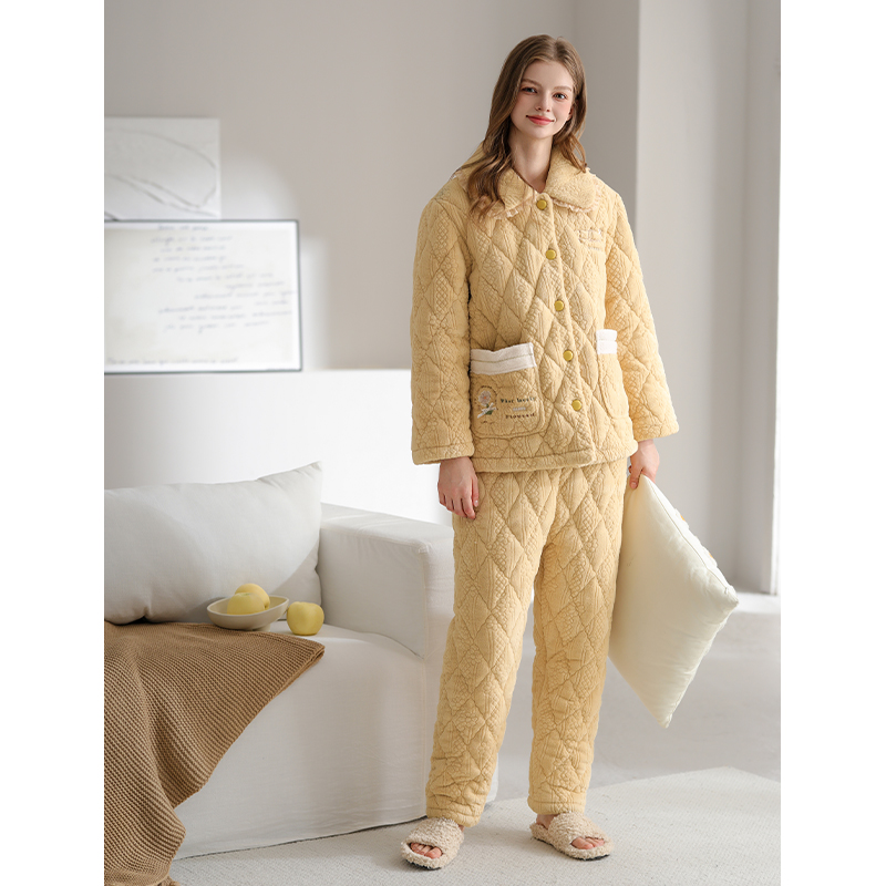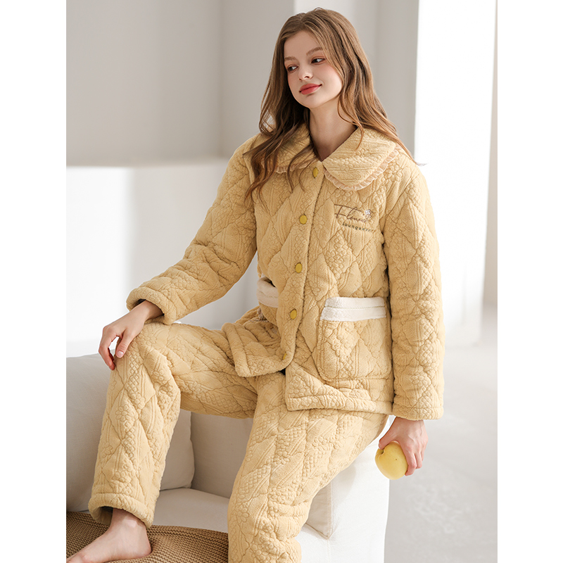 芬腾冬季珊瑚绒夹棉睡衣女三层加厚棉袄保暖冬天法兰绒家居服套装