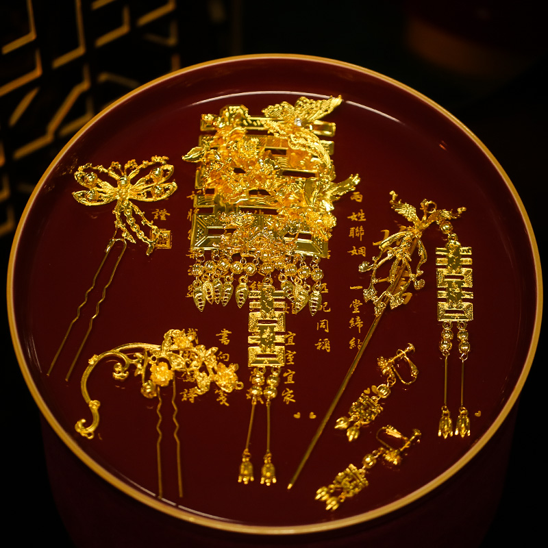 新娘中式婚礼金色龙凤褂头饰套装秀禾汉服旗袍发饰喜字簪子