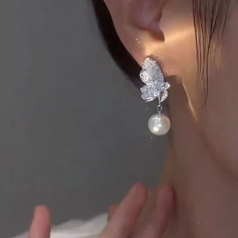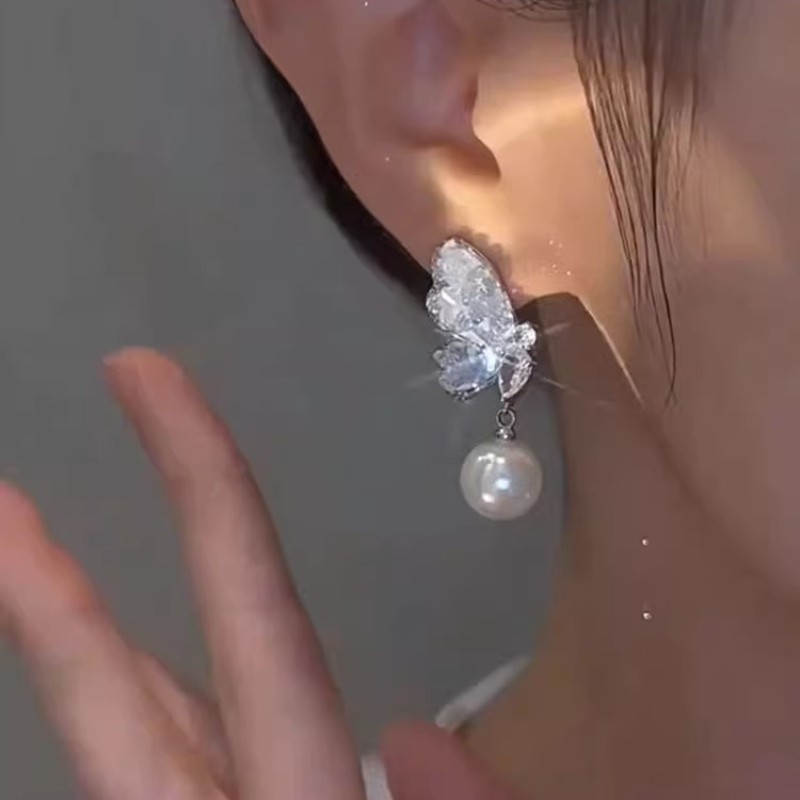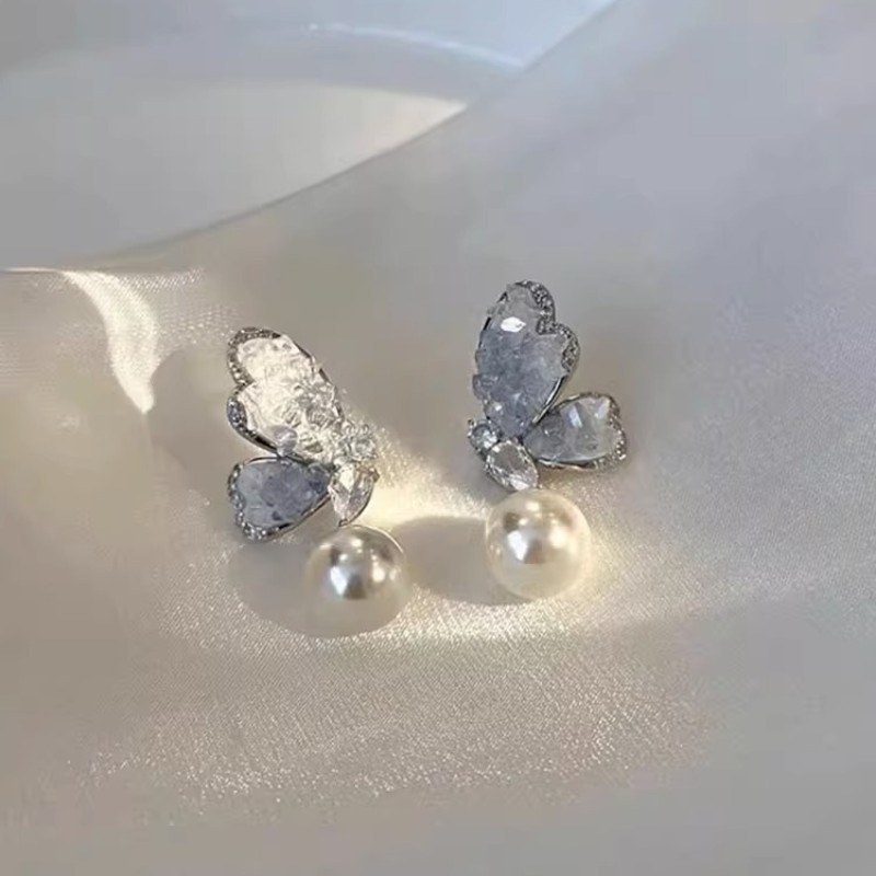 渐变蓝水晶蝴蝶珍珠耳环女2025年新款爆款耳饰小众设计感高级耳钉