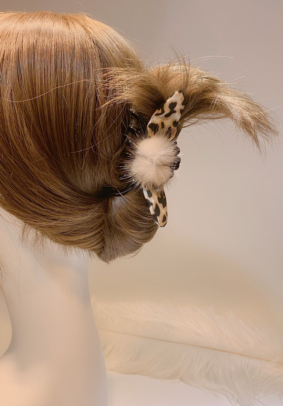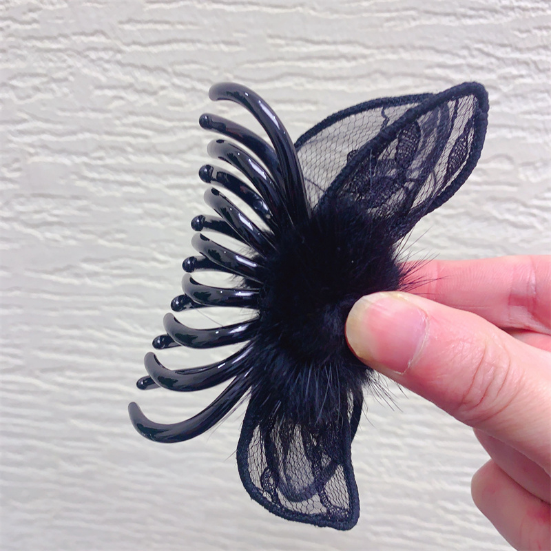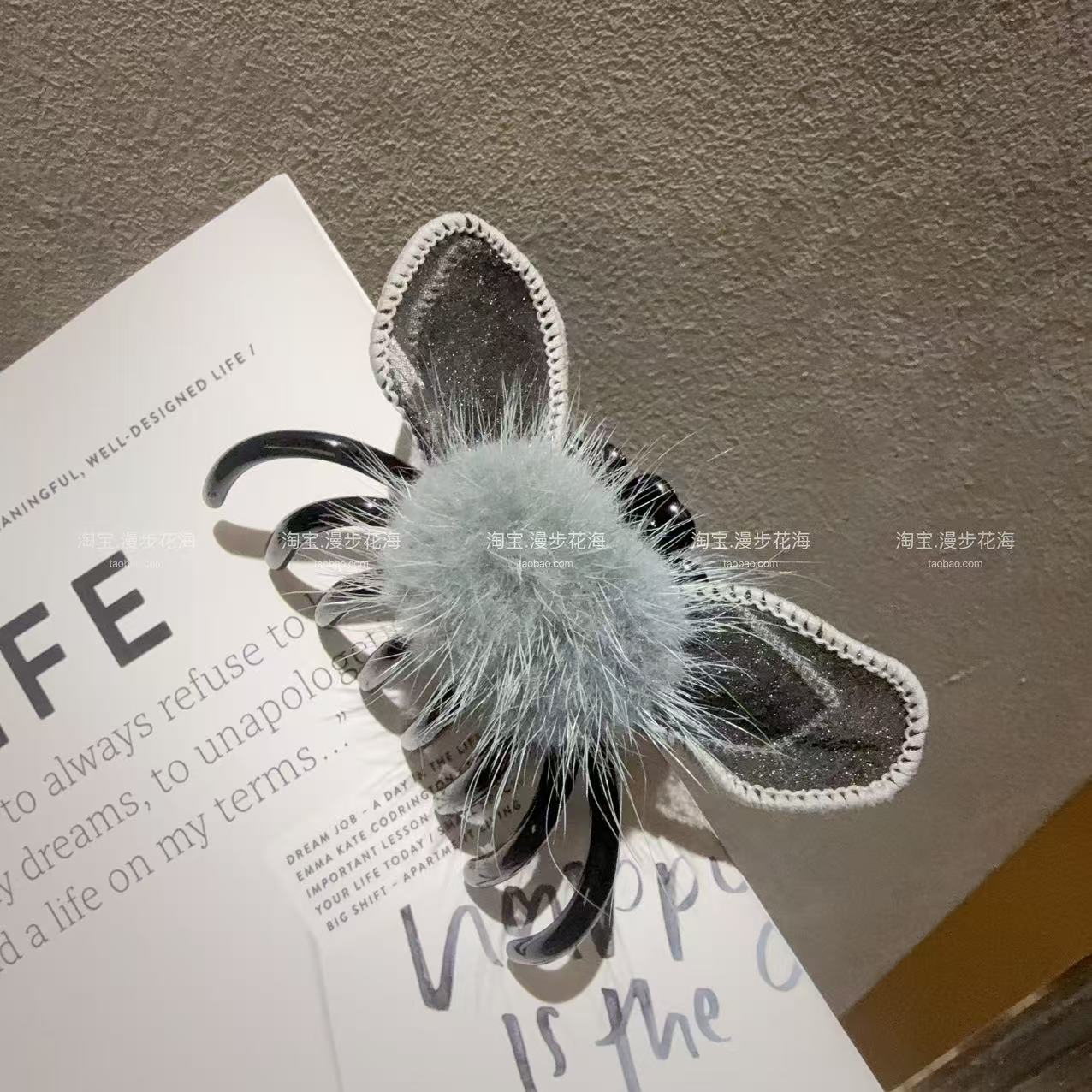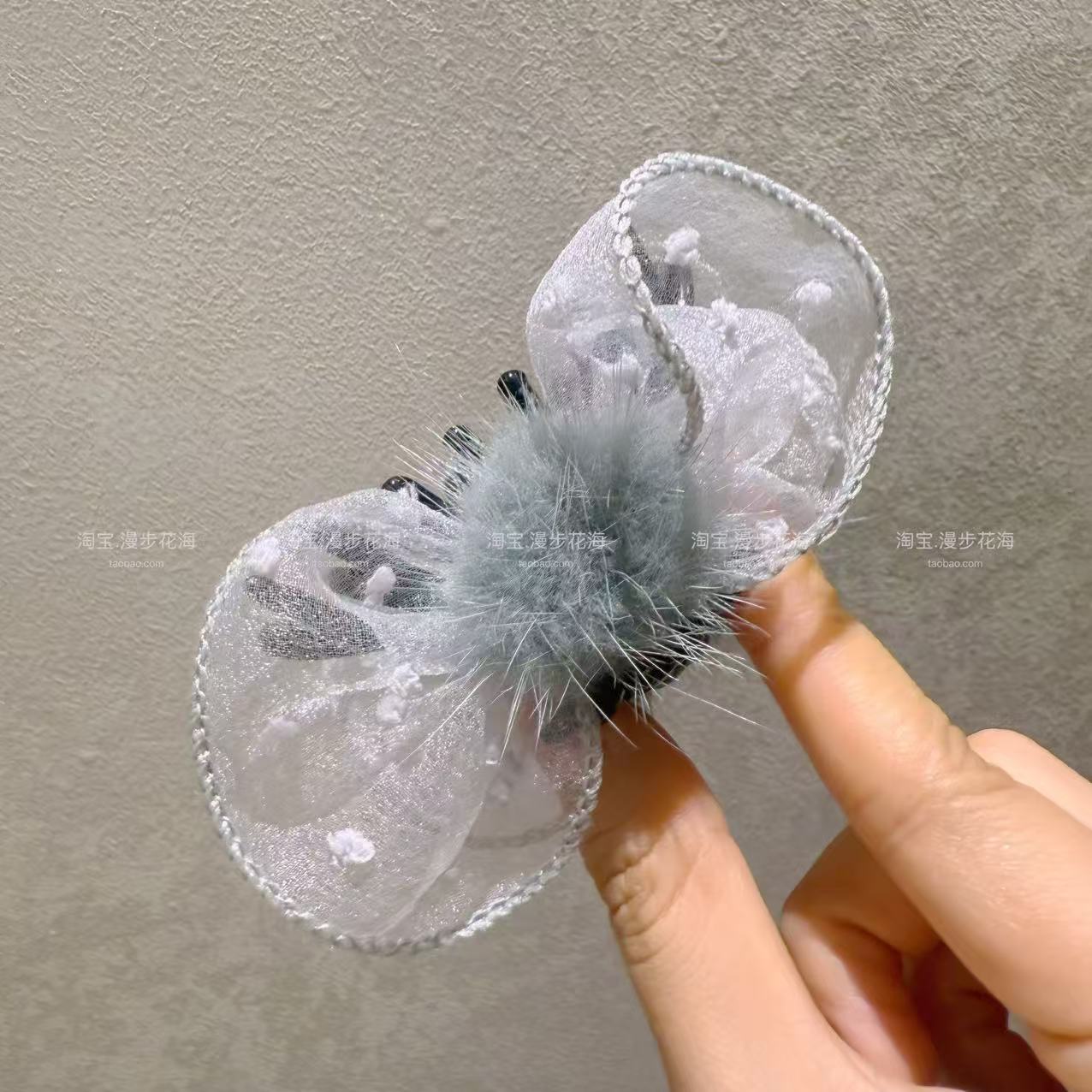 韩国气质秋冬兔毛水貂毛球球点点纱蝴蝶结中号抓夹发夹边夹软萌女