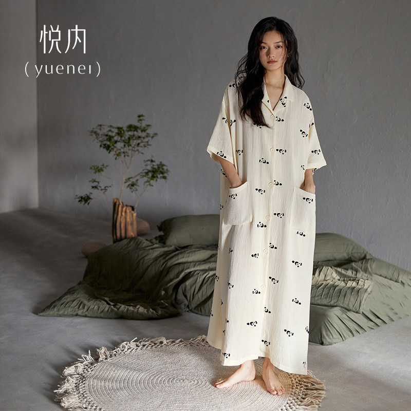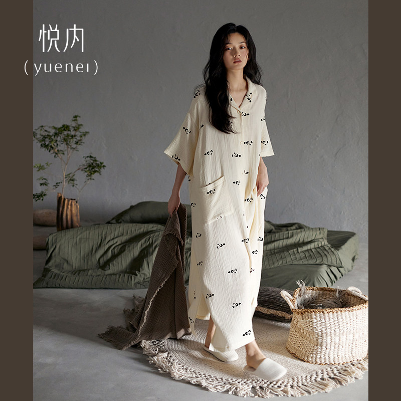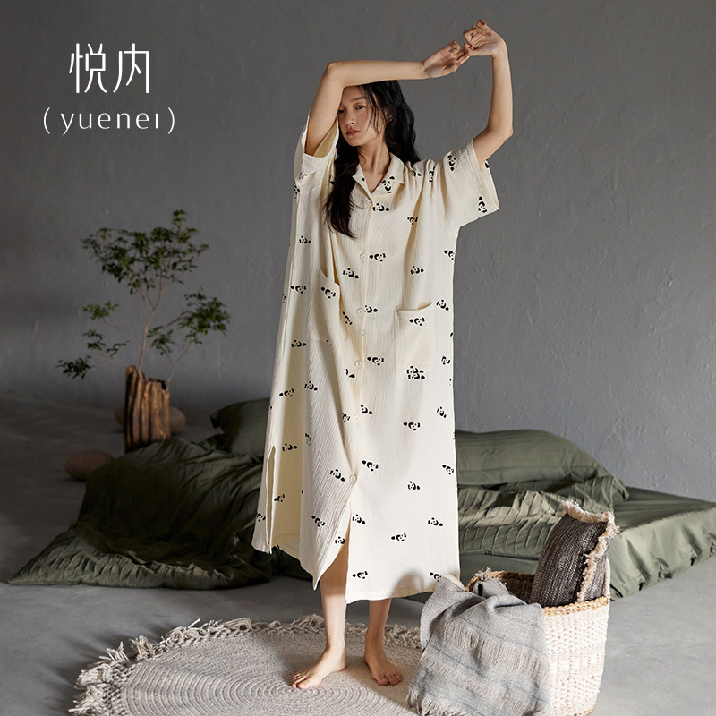 2024新款睡衣睡裙女款夏季夏款纯棉纱布短袖开衫长款全棉大码熊猫