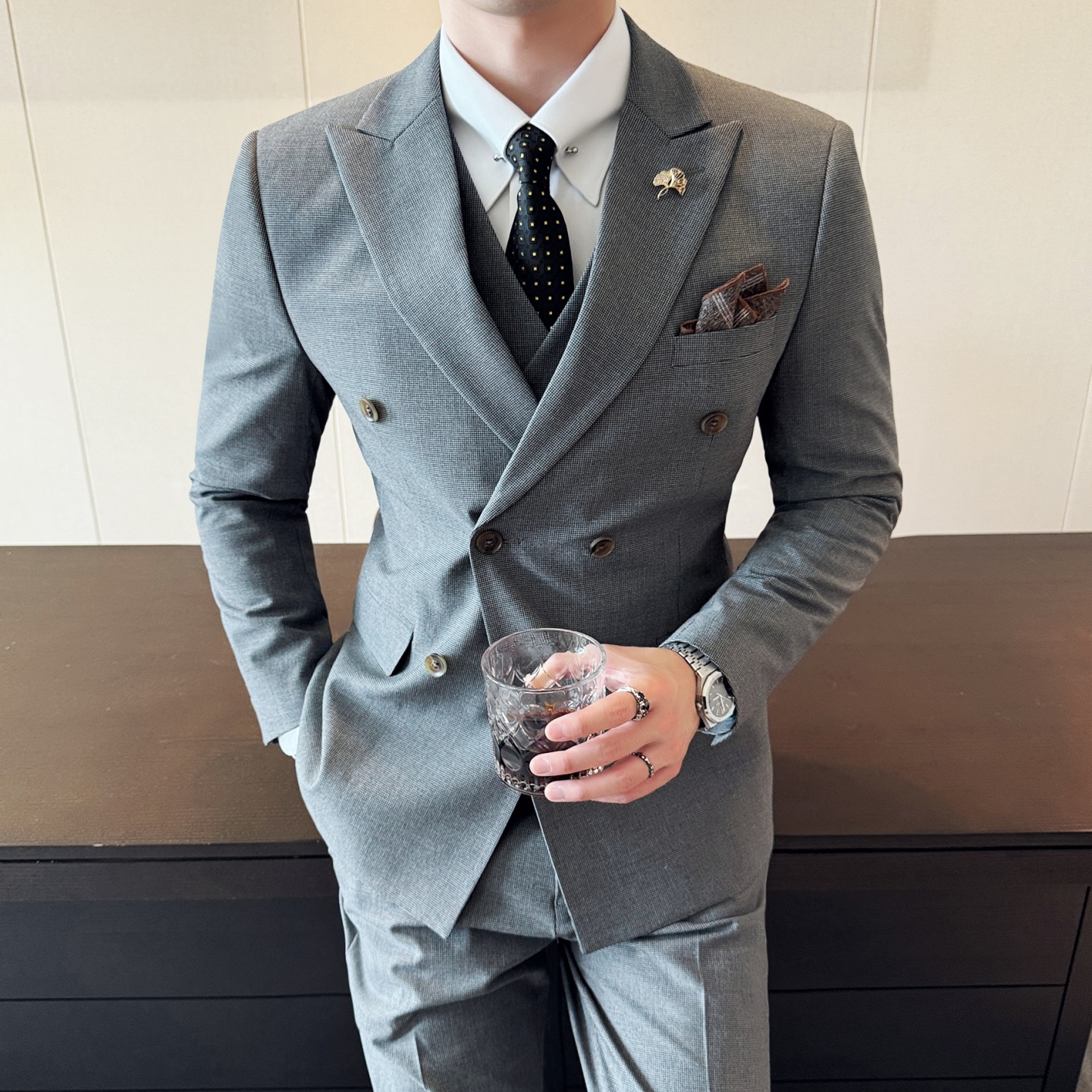 商务绅士风双排扣西服男士千鸟格套装高级灰修身正装新郎结婚礼服