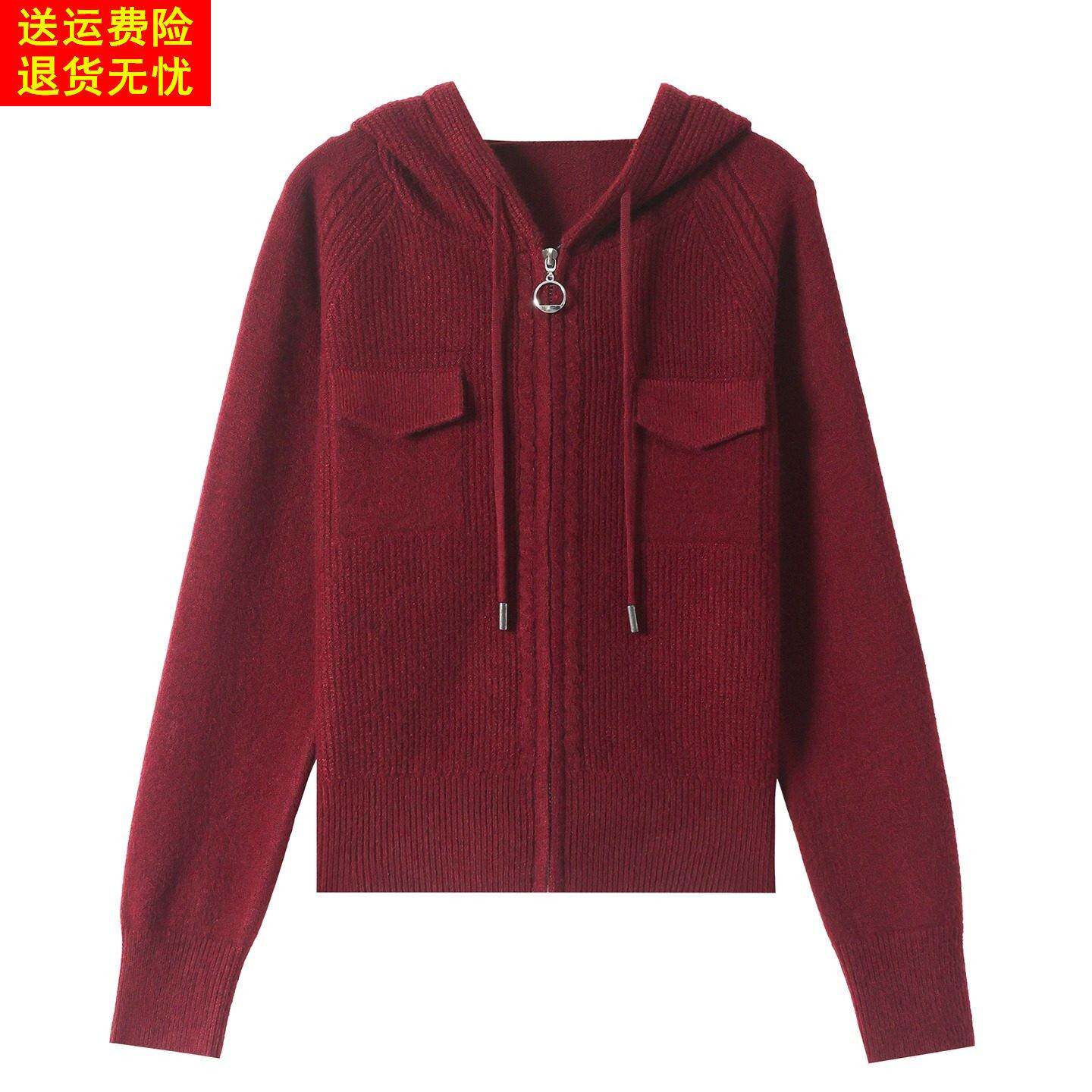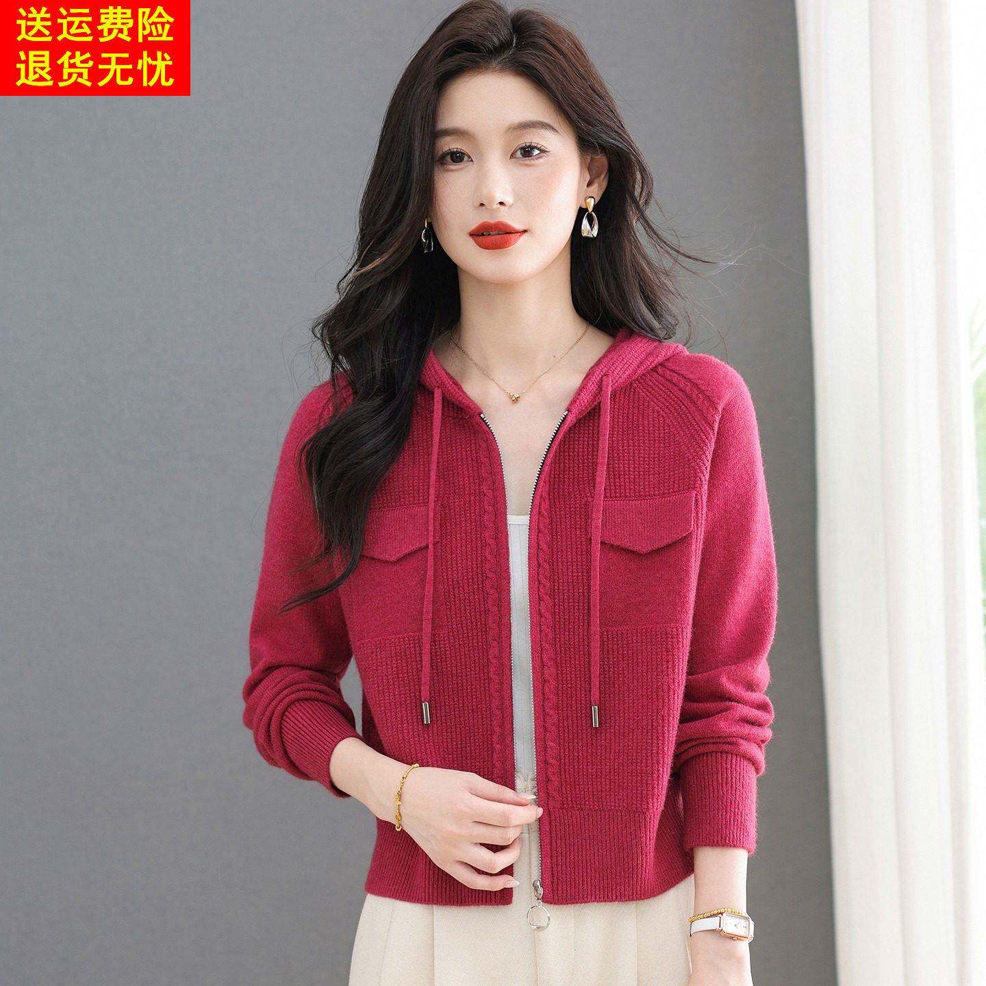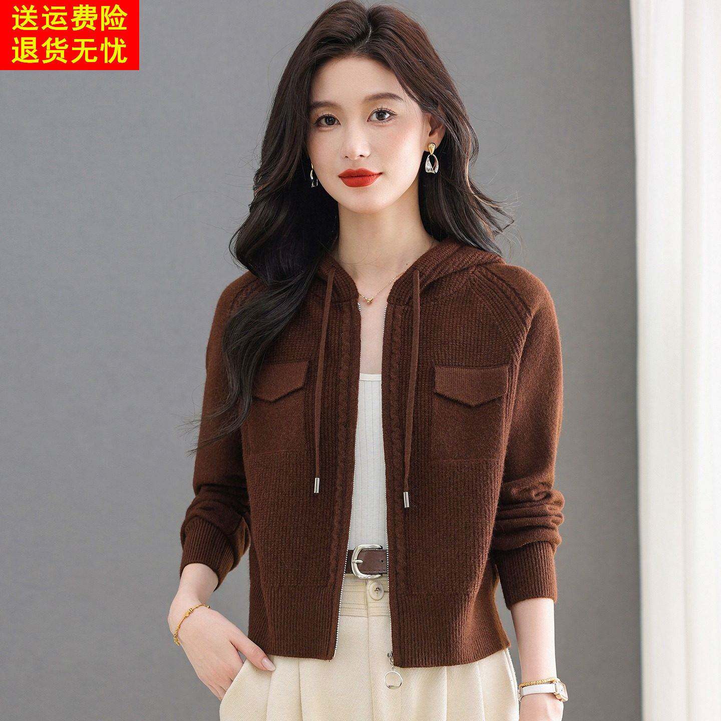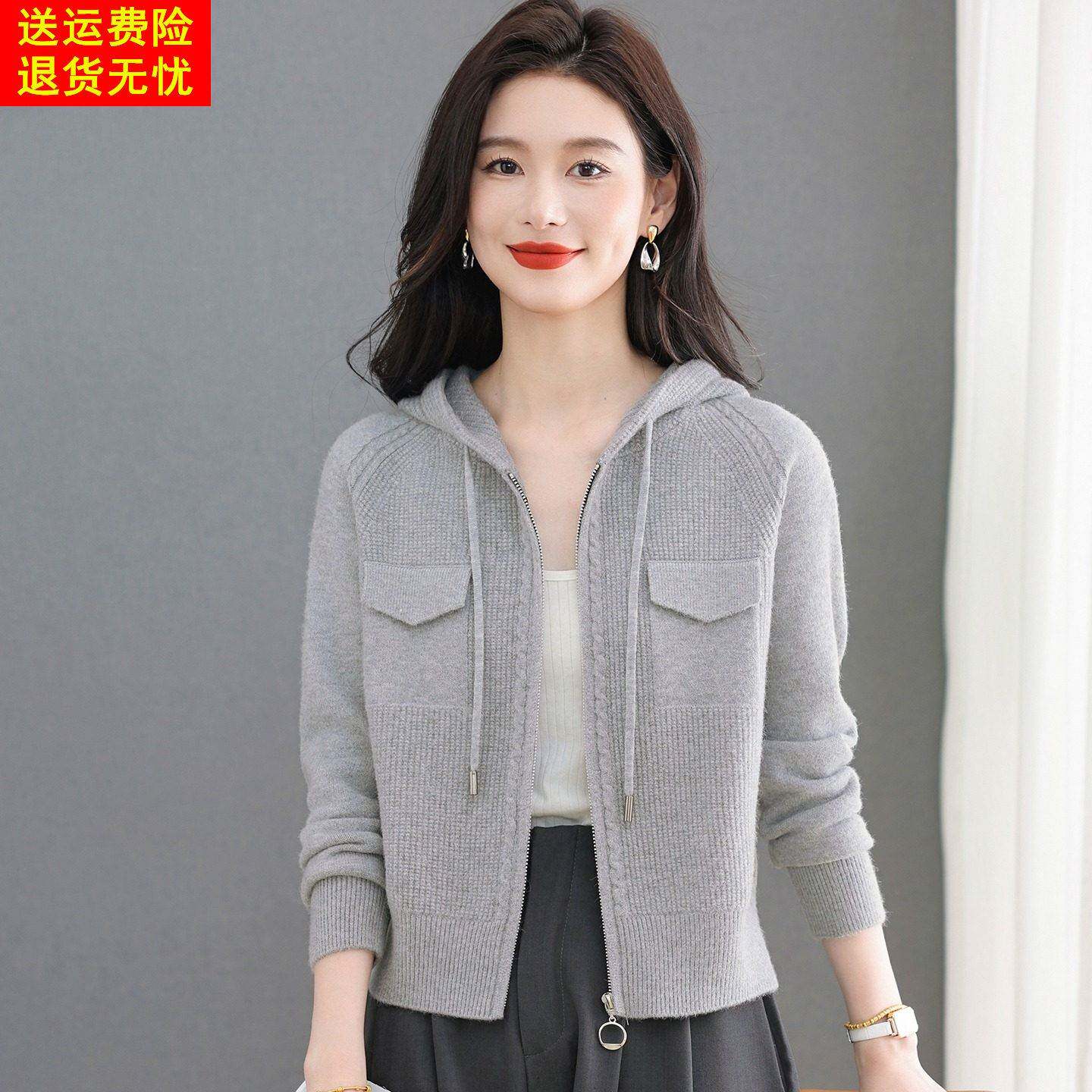 鄂尔多斯市连帽纯羊毛针织开衫女士秋冬新款羊绒毛衣外套短款上衣