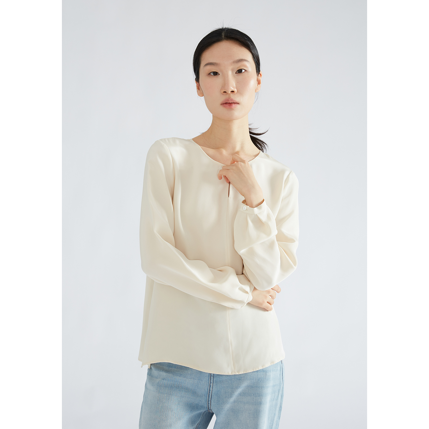 特惠 重绉30姆米真丝长袖上衣休闲T恤女100%桑蚕丝一粒扣衬衣夏