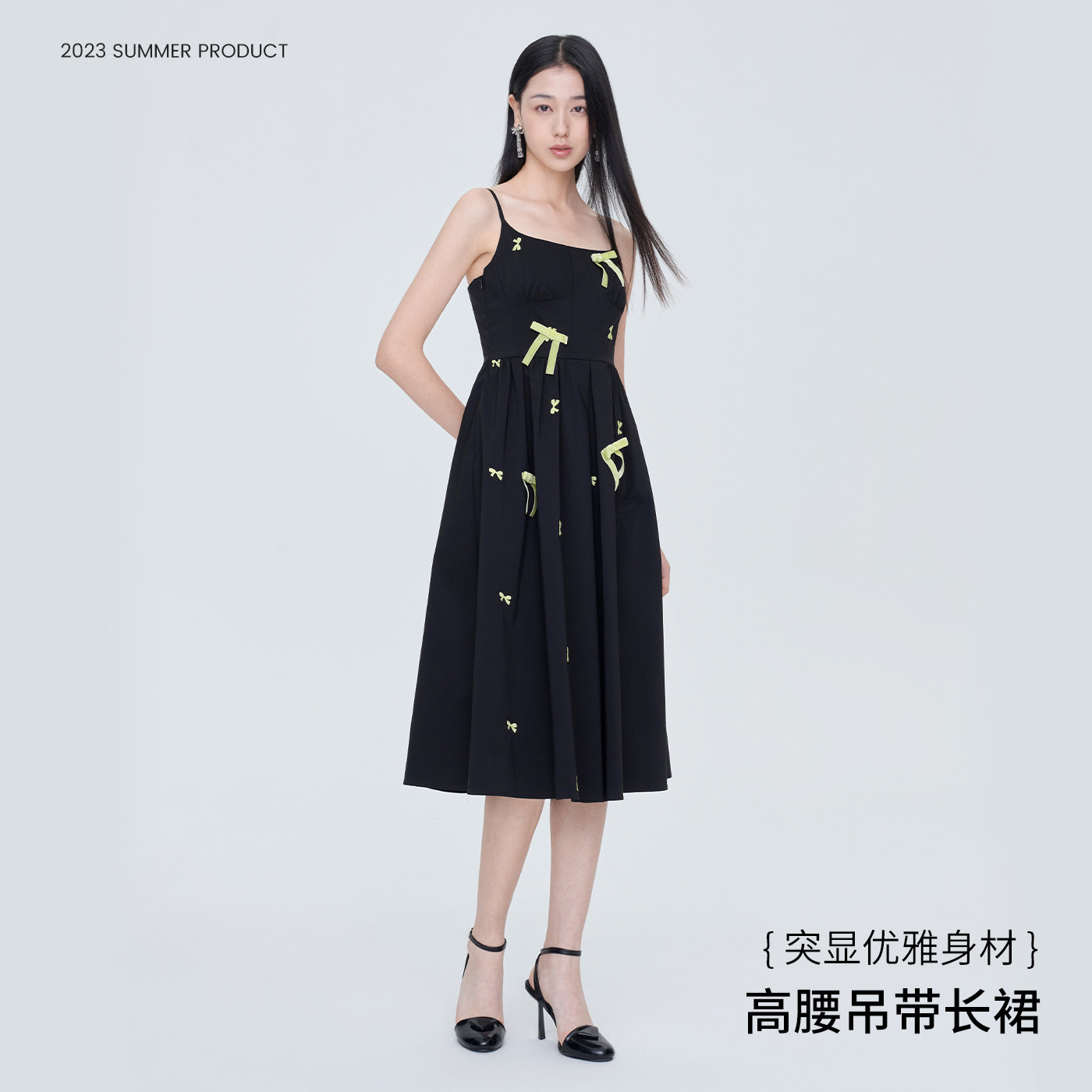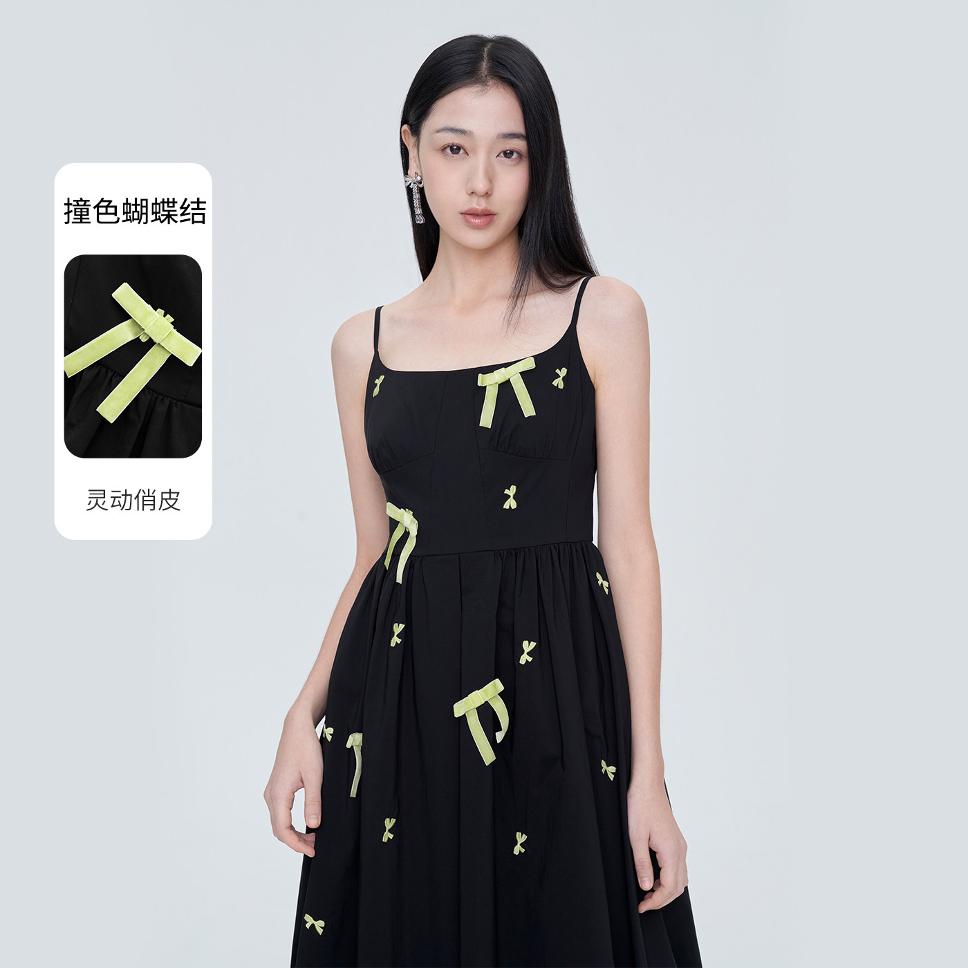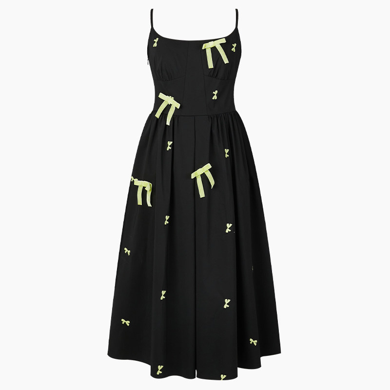【商场同款】糖力撞色蝴蝶结刺绣吊带连衣裙女夏季显瘦中长款裙子
