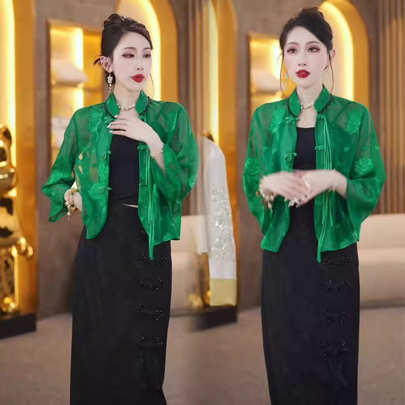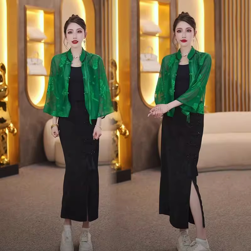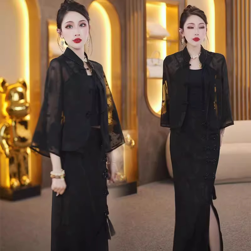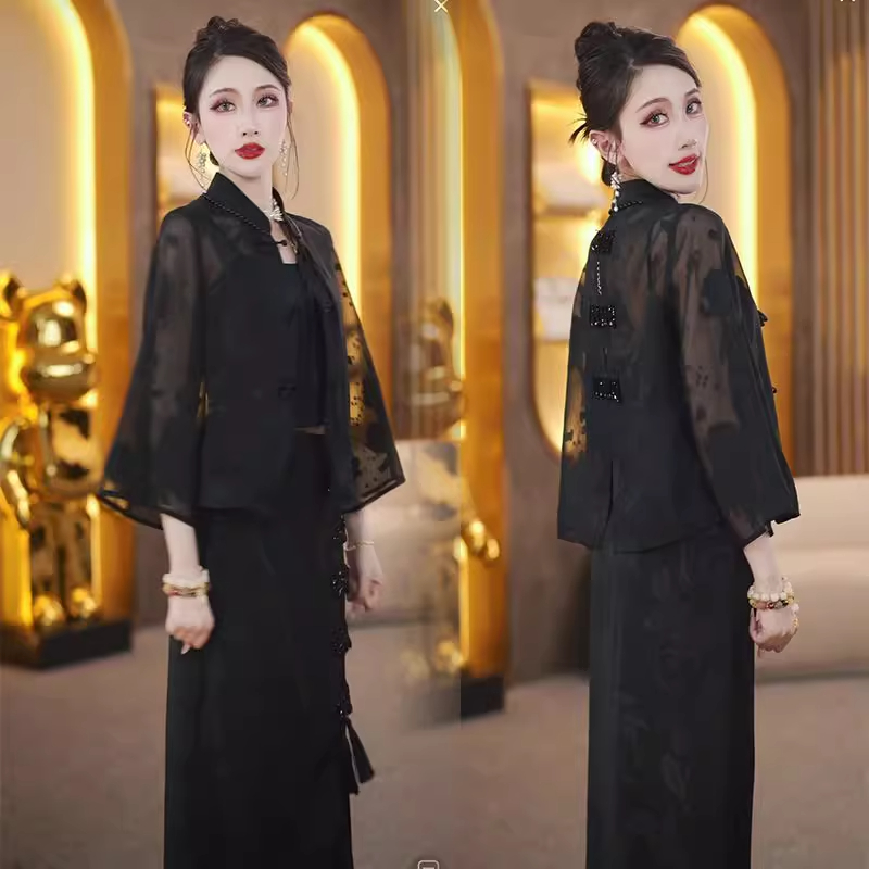 新中式盘扣套装女2025夏季新款国风短外套+黑色开叉半身裙两件套