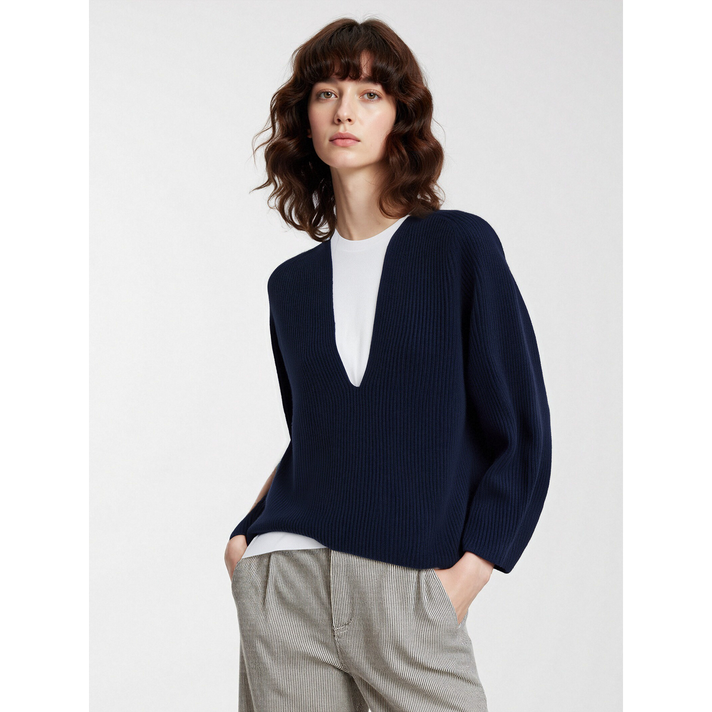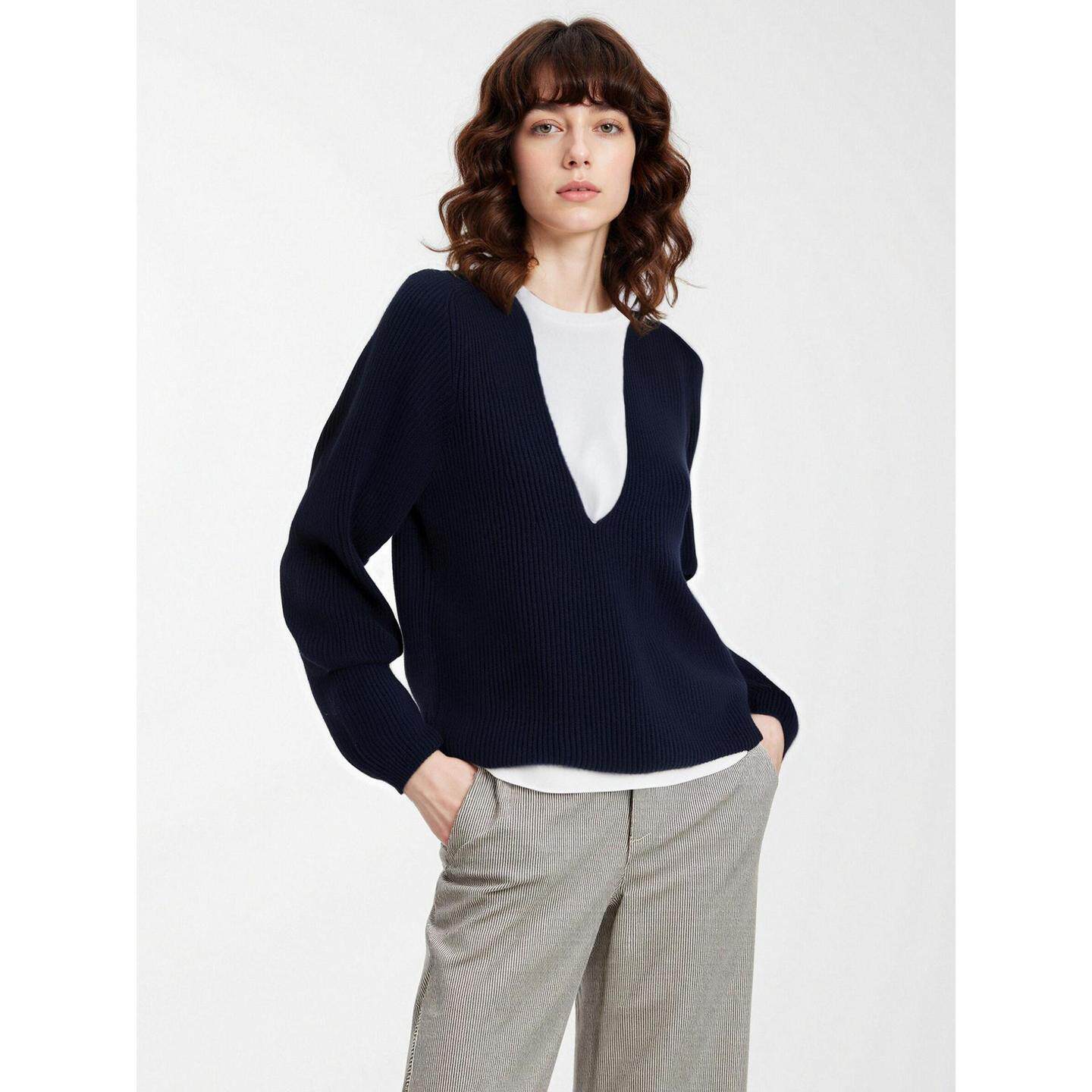 Basic House/百家好藏蓝色V领针织衫女士冬季含羊毛宽松加厚毛衣