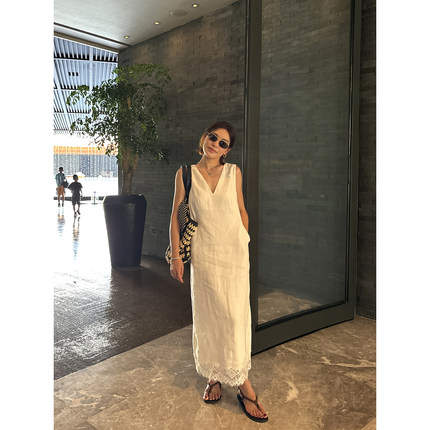 亚麻V领气质度假背心连衣裙