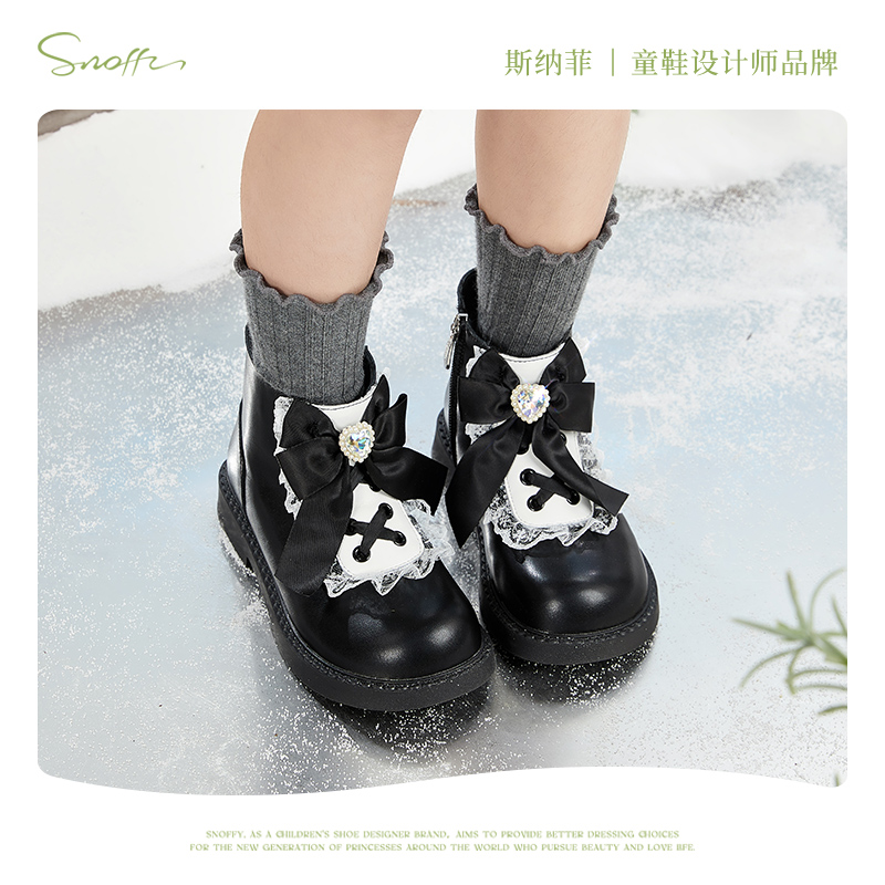 斯纳菲儿童靴子女童短靴真皮2025秋冬新款小公主二棉黑皮靴马丁靴