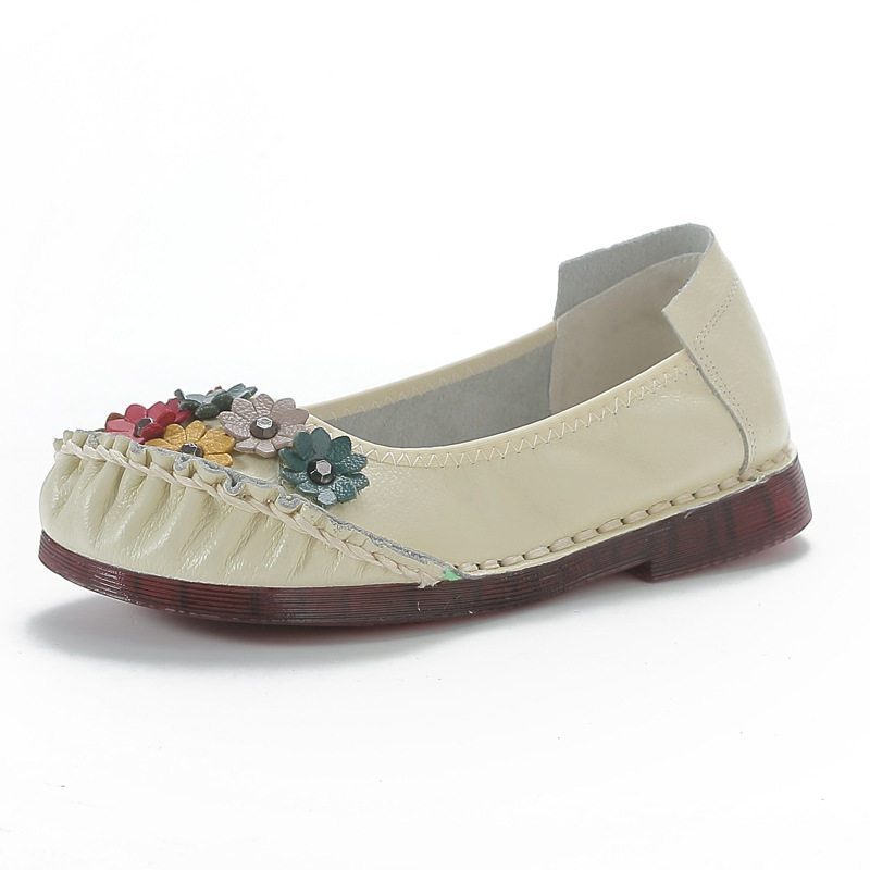 春浅口平跟女鞋民族风真皮牛筋底中老年花朵女单鞋舒适柔软妈妈鞋