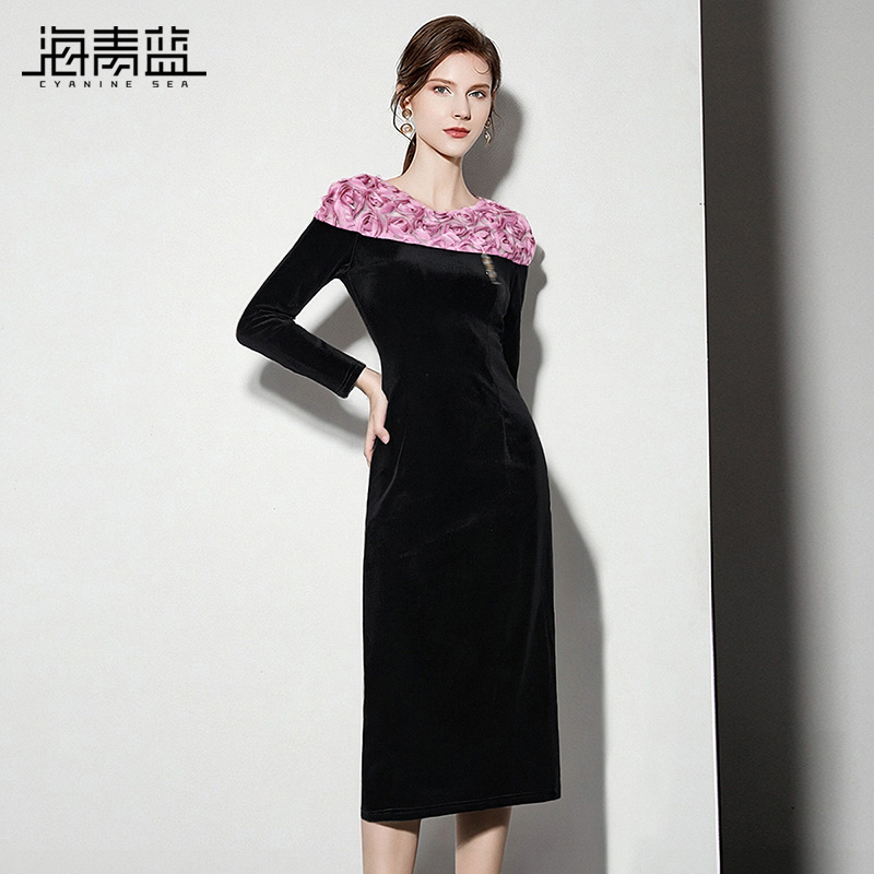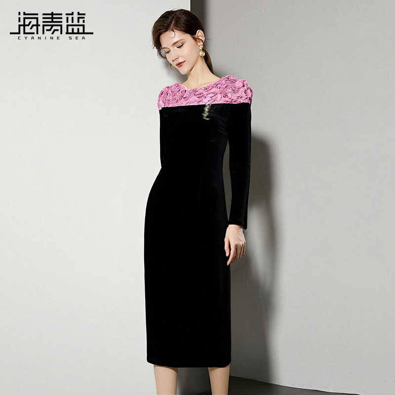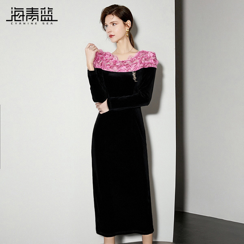 海青蓝 秋冬长袖连衣裙2025年新款时尚气质女装高端中长款裙子