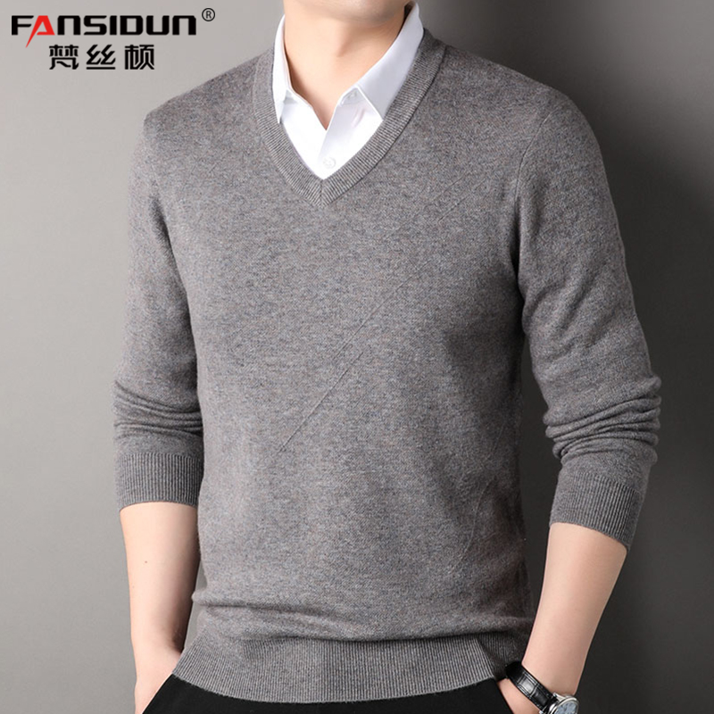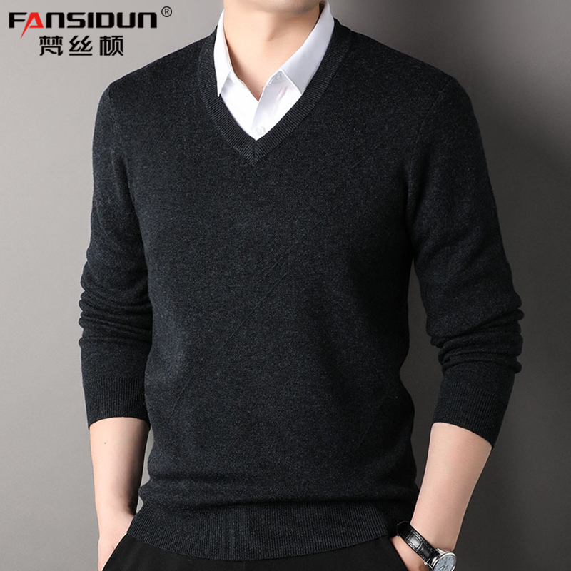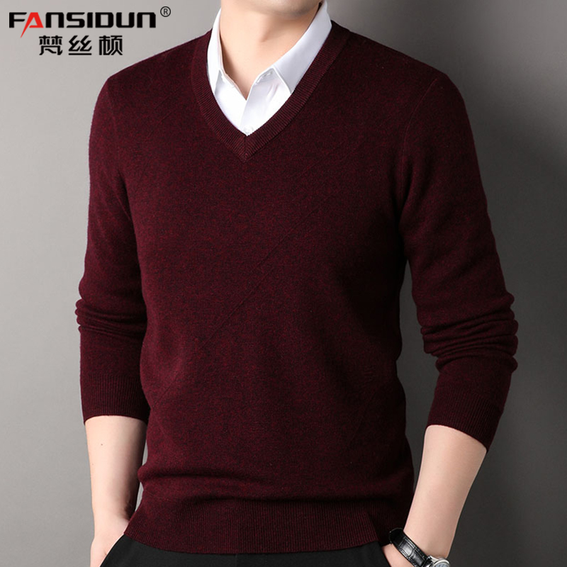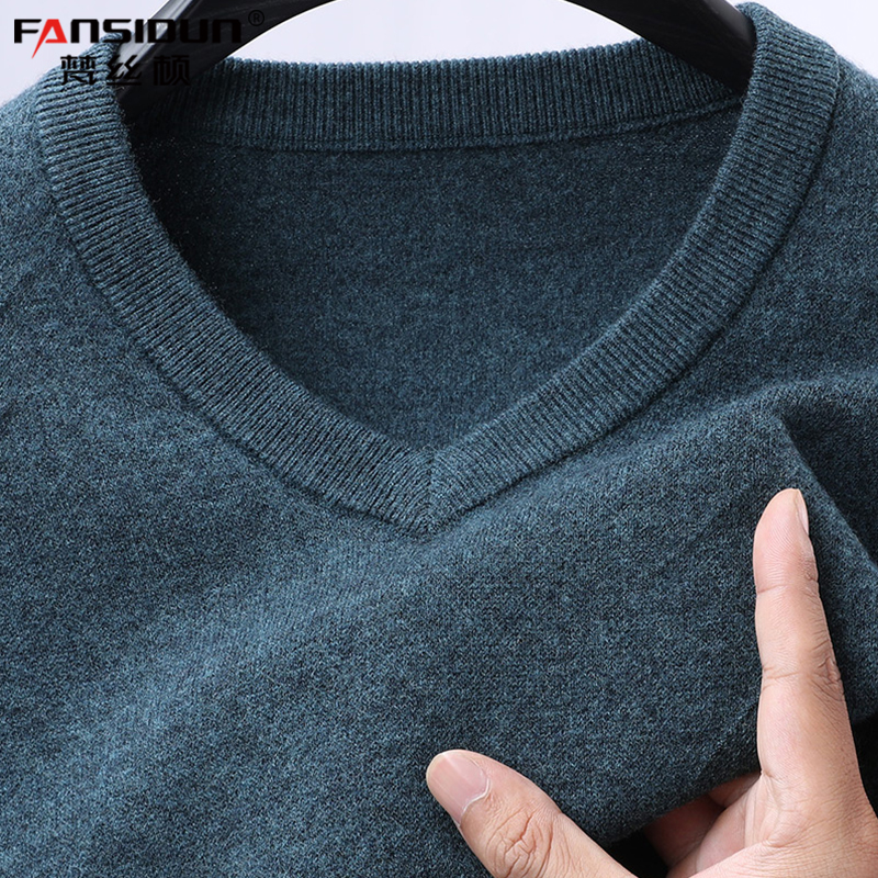 男士纯羊毛衫中年人冬季加厚四平针织打底衫鸡心低领V领保暖毛衣